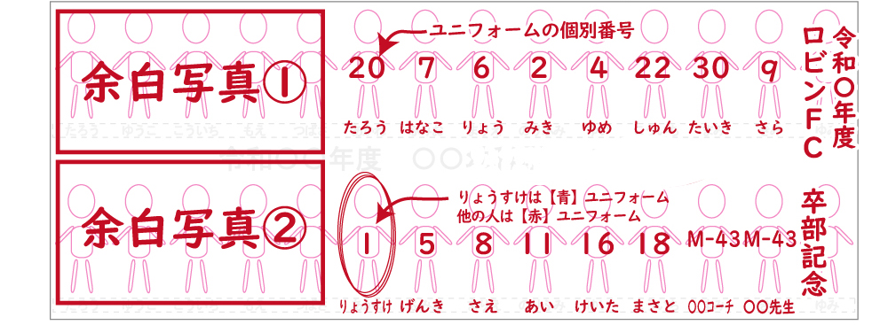 ※お洋服の指定がある場合は、【〇〇さん(Y-13)】【〇〇さん(オリジナル青ユニフォーム胸番号2)】という形でそれぞれ指定をお願いいたします。