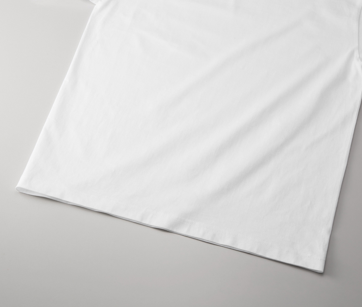 糸を紡ぐ際に毛羽が表側に出ないよう、内側に収束して紡ぐ「コンパクトコーマ糸」を使用した、上質でなめらかなさわり心地を実現したTシャツ。コンパクトコーマ糸は、通常のリング糸と比較すると各段に少ない毛羽立ちと丈夫さをもつ上質な糸なので、表面のなめらかさはプリントなどの二次加工にも最適。さらに、適度な厚みのある生地にこだわり、普遍的なサイズ感にすることで、ストリートはもちろんのこと、シックな装いや、ヨーロピアンカジュアルなスタイルなど、さまざまなスタイリングにアジャストします。