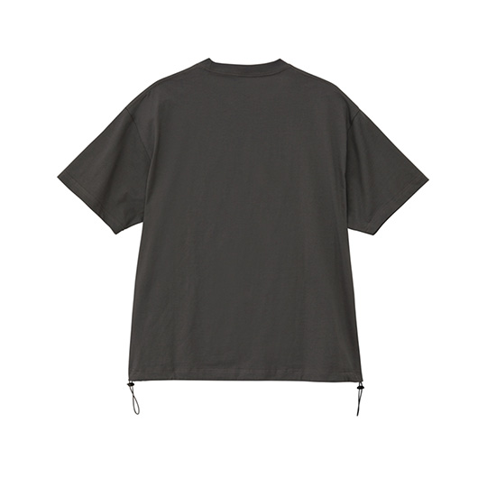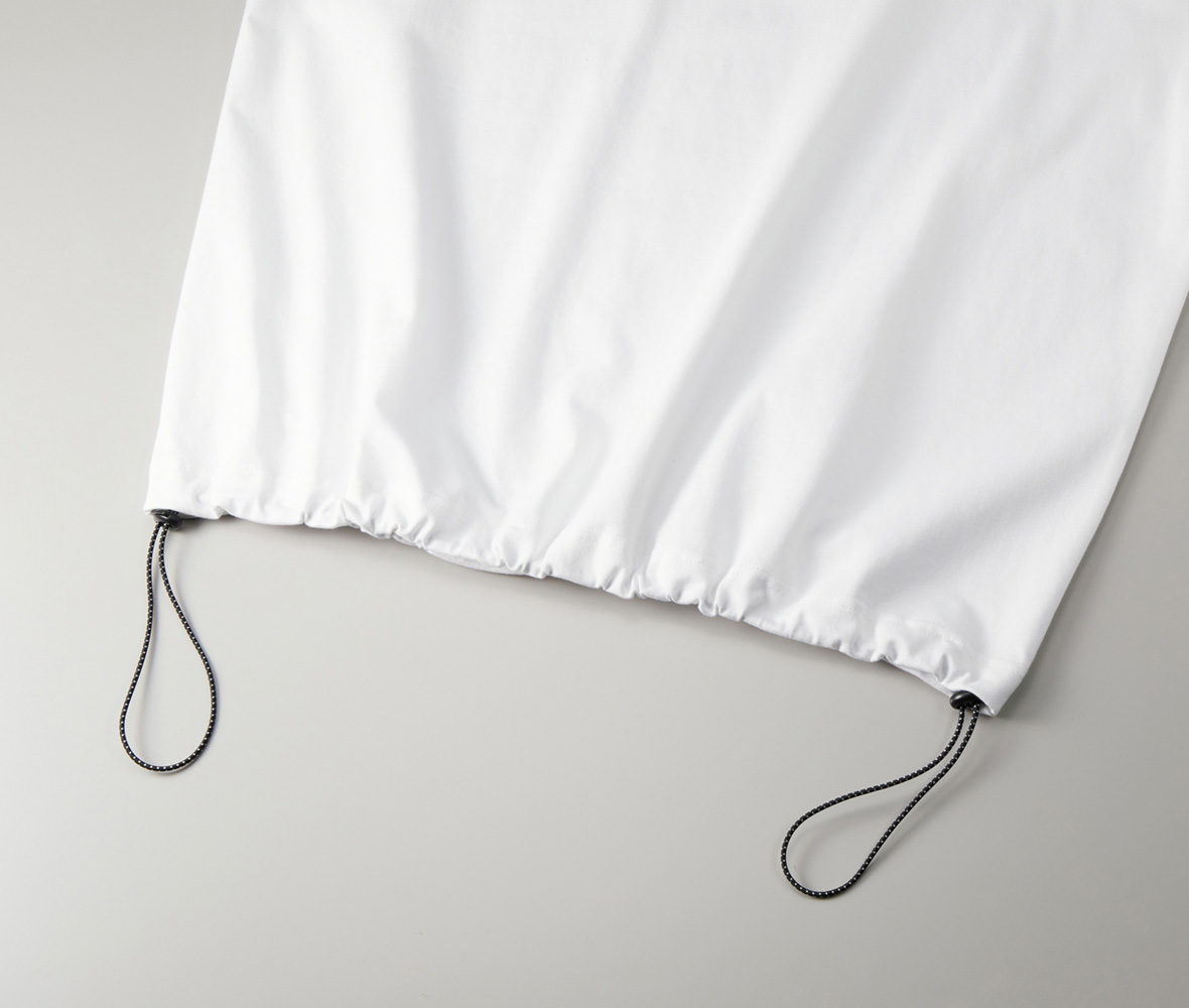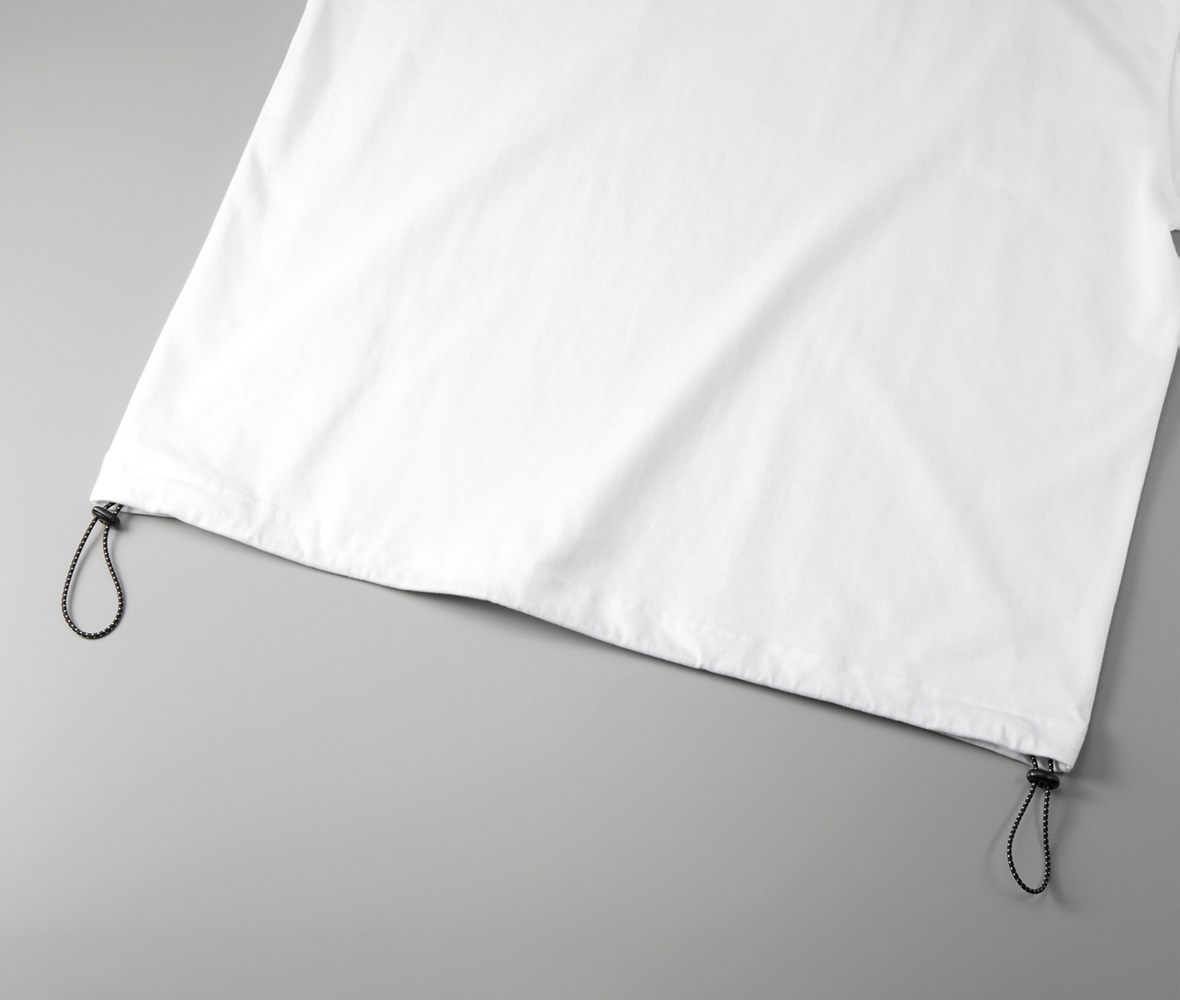 左右の裾口に、アクセントとなるバイカラーのドローコードを配したTシャツ。ドロップショルダーで全体的にゆったりとしたシルエットに仕上げており、裾を絞って好みの丈に調整することでシルエットに変化を加えられます。さらに、裾を絞らずそのまま着ればリラックスした雰囲気に。また、カジュアルでありながらも、毛羽の少ない「コンパクトコーマ糸」を使用した上質でなめらかな生地を採用しているため、大人の品が漂います。綿100%生地なので、お好みの加工を施すことも可能。夏フェスのグッズや、ゴープコア系アイテムなど、幅広い用途にアジャストすること間違いなしの一品です!