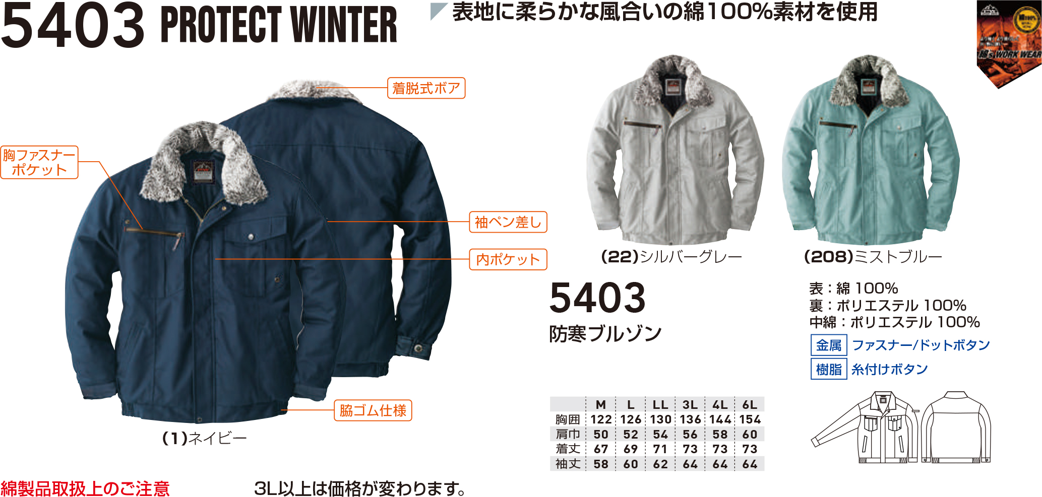| 表地に柔らかな風合いの綿100%素材を使用した暖かな防寒ブルゾンです。