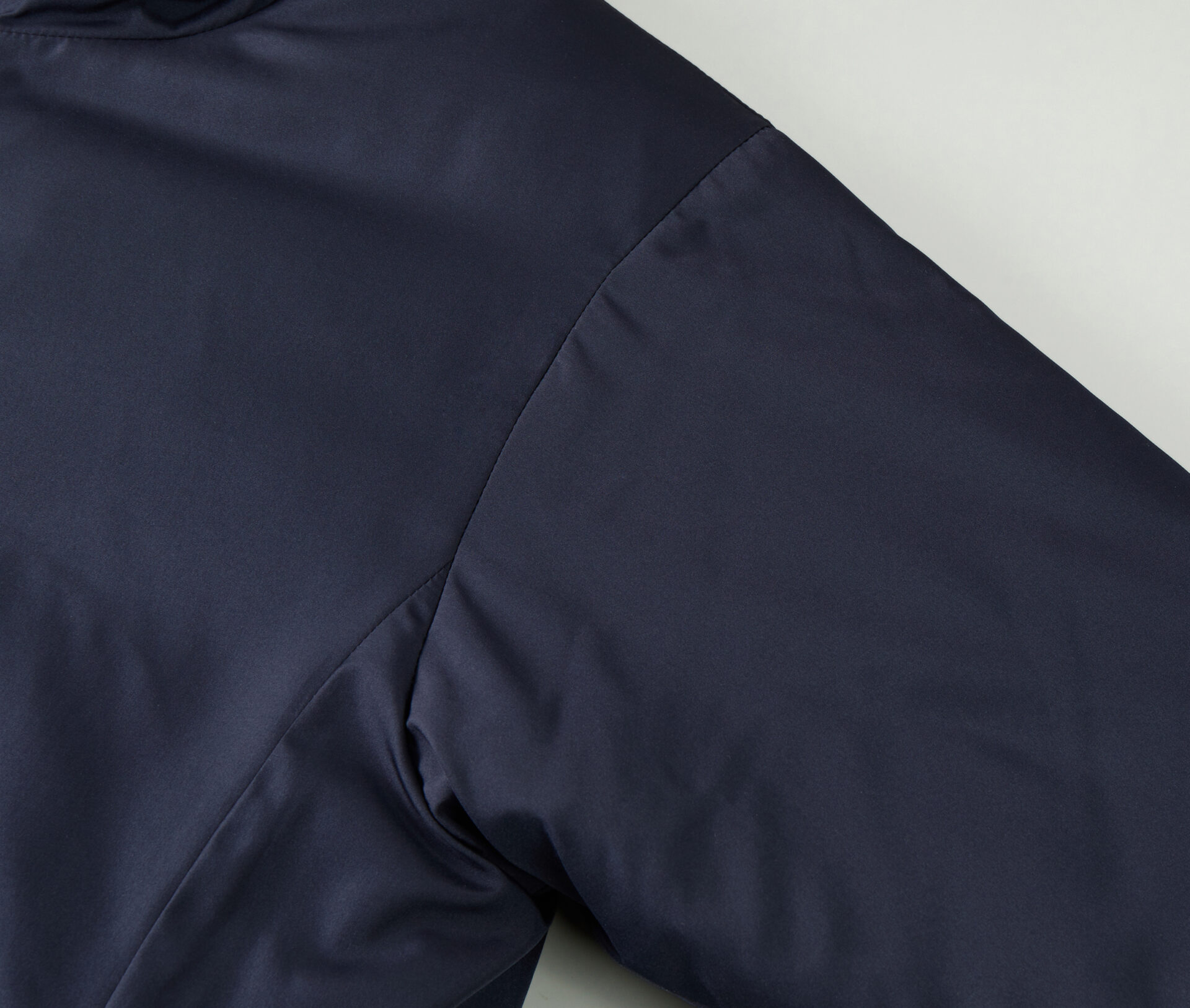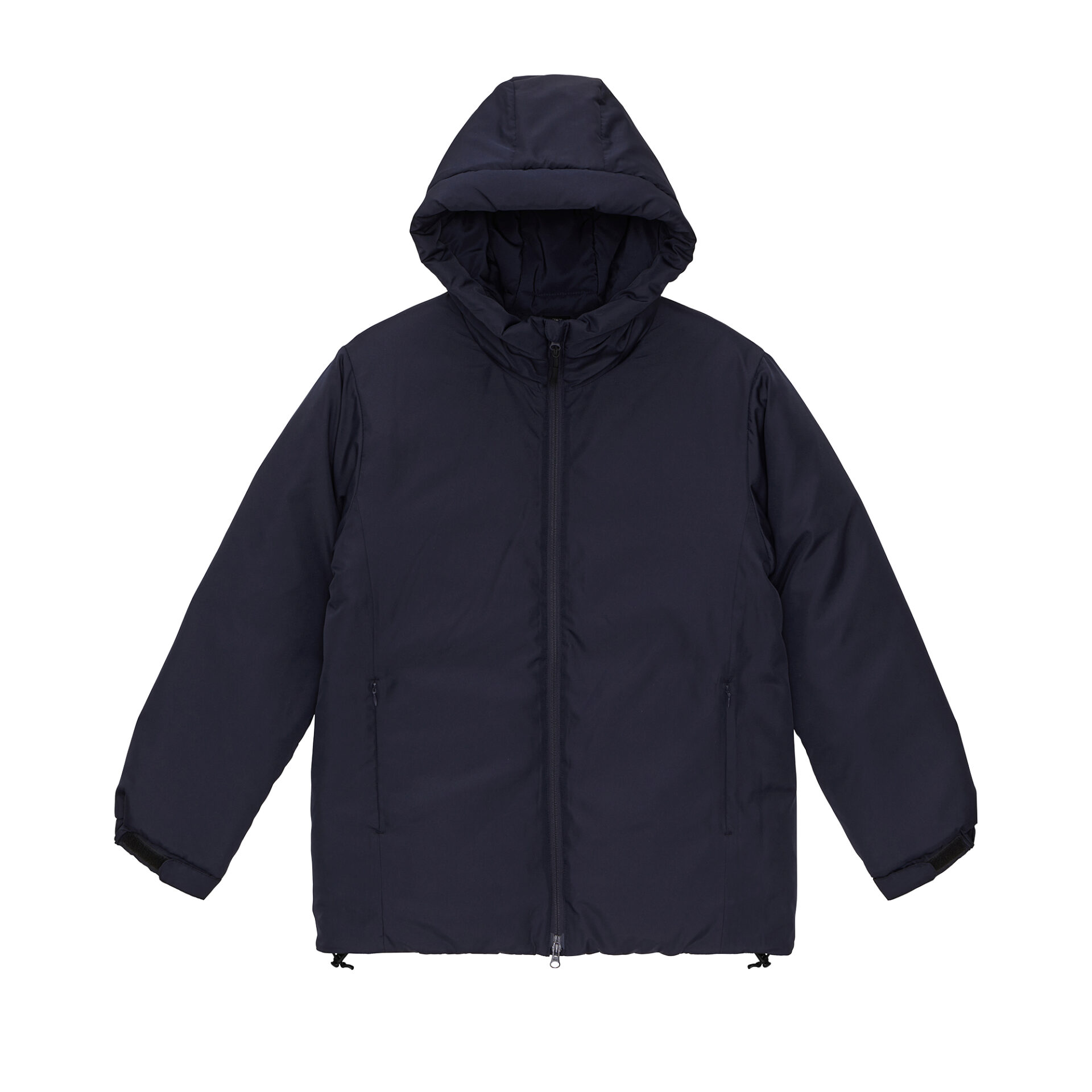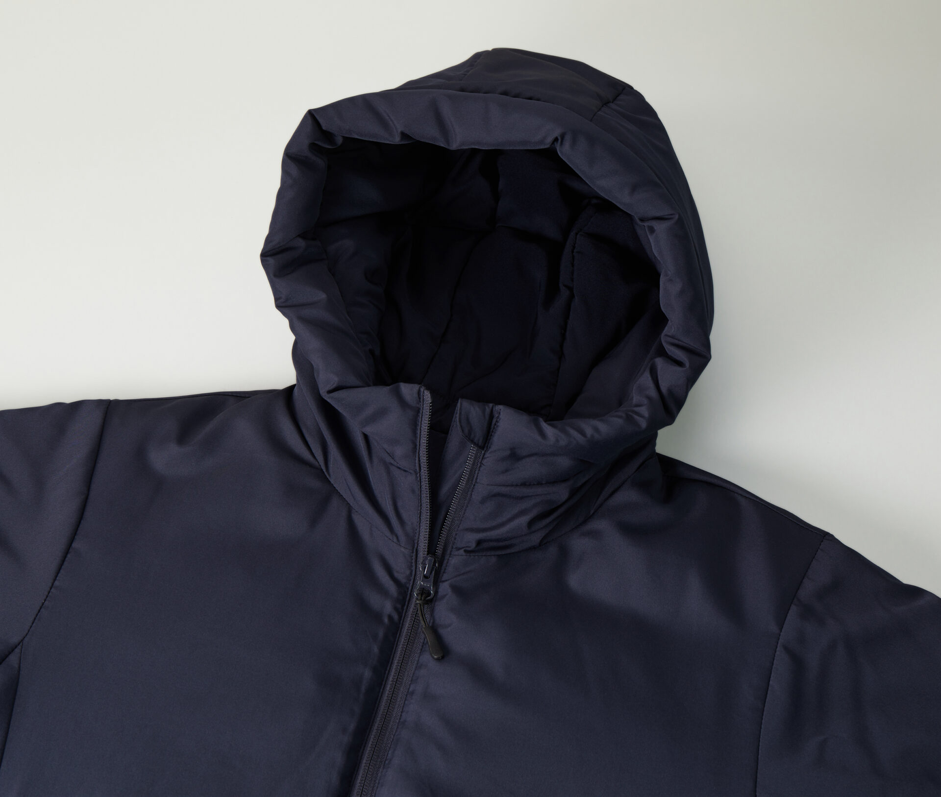 フードタイプの中綿パーカは、シンプルなデザインでどんなシーンにもマッチする万能アイテム。高密度タフタ生地を使用しており、軽量さと上品な光沢感が魅力です。表地はハリ感を出すためアクリルコーティングを施しながら、裏地はあえてコーティングを施さずに肌当たりを良くしました。チンガード付きのフロントジップは、上まで閉めればハイネック仕様であたたかさをキープ。袖口と裾口を絞ることができるため、丸みのあるシルエットに調節できるほか、秋冬の冷たい風の侵入を軽減します。内側の裾部分には、袖まで加工が可能なコンシールファスナーを配し、加工のしやすさも担保しています。