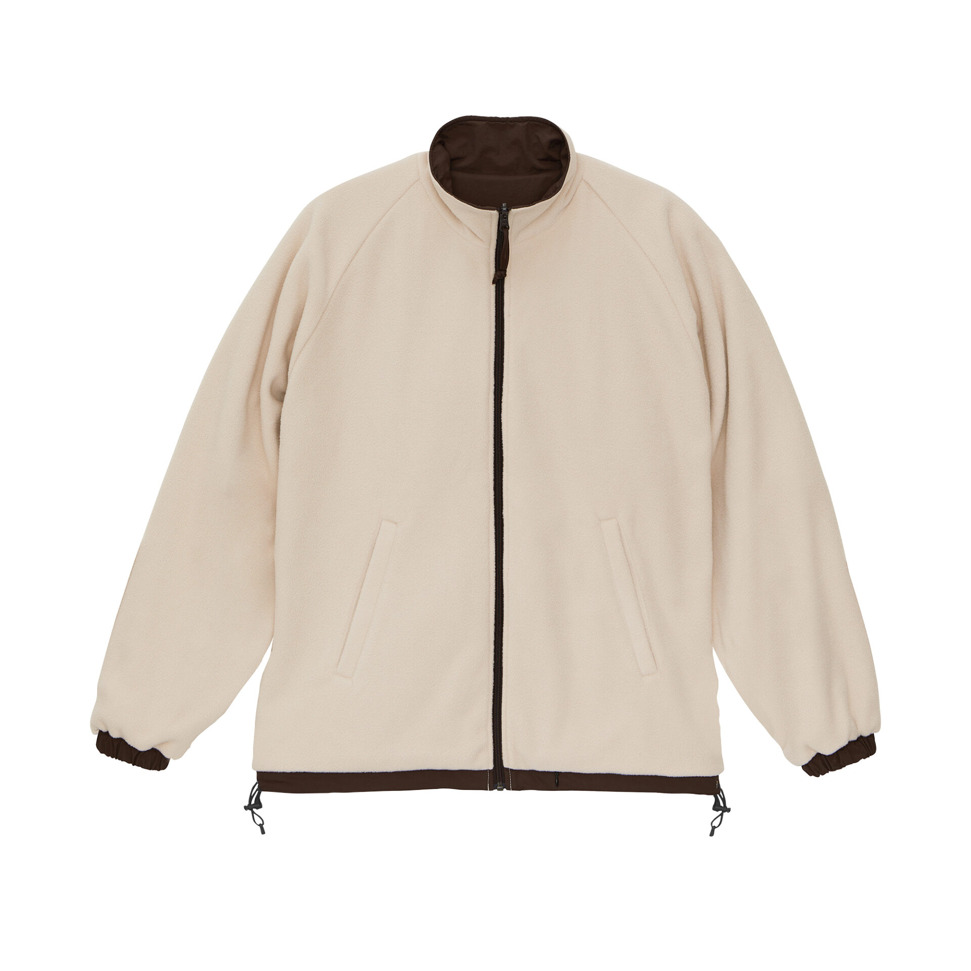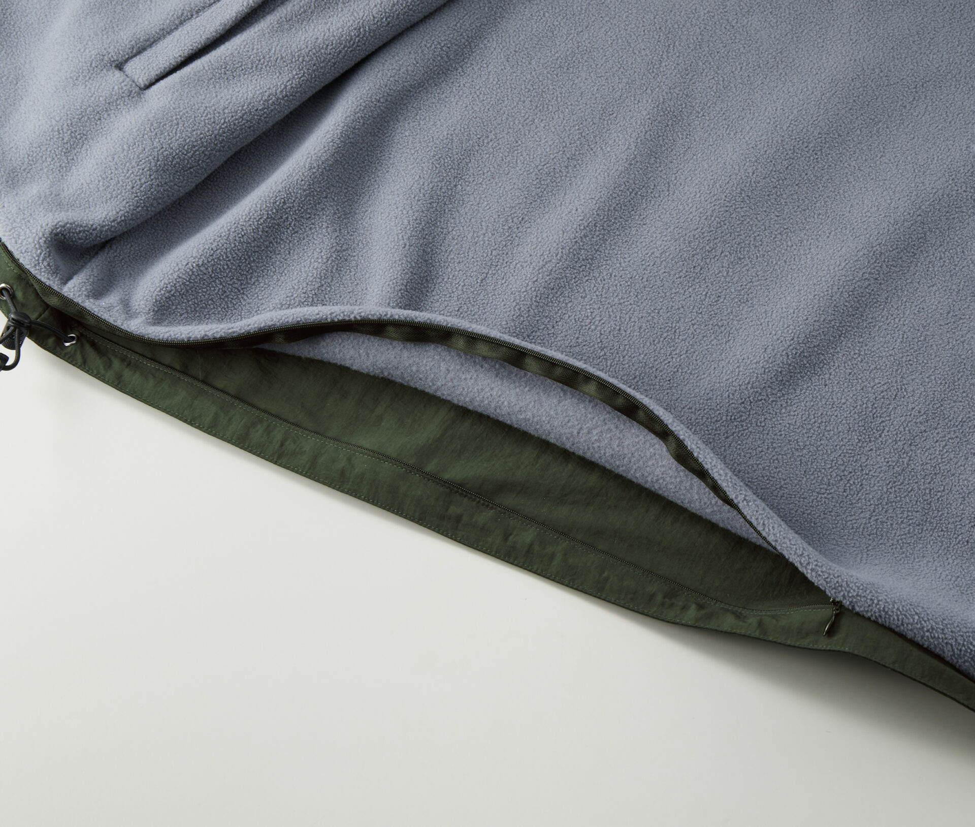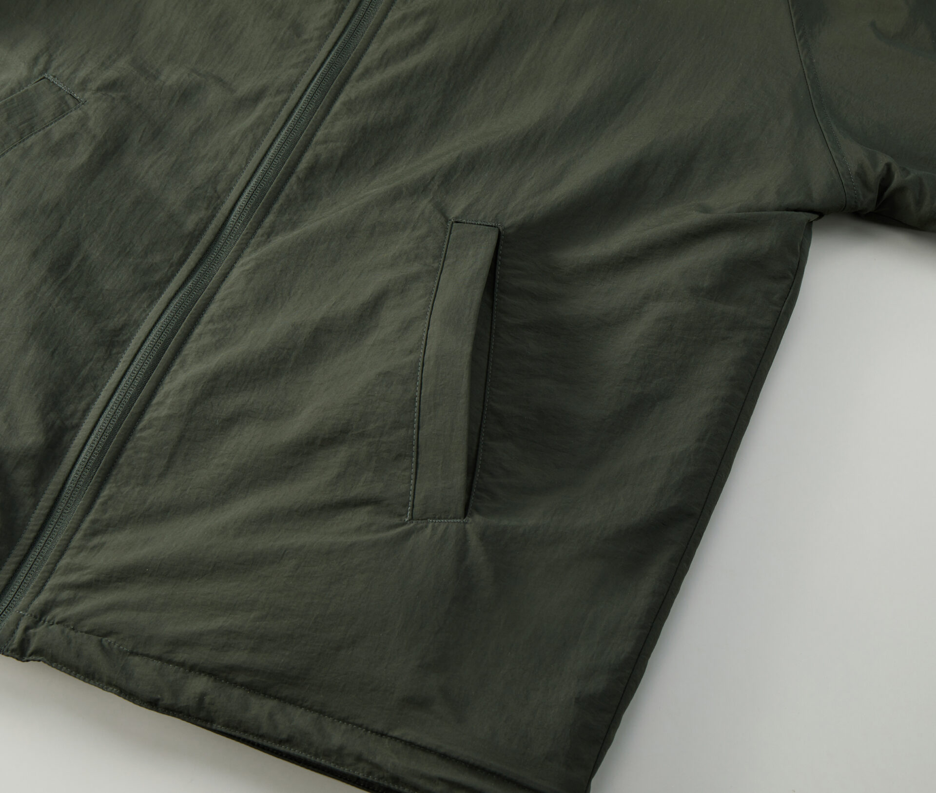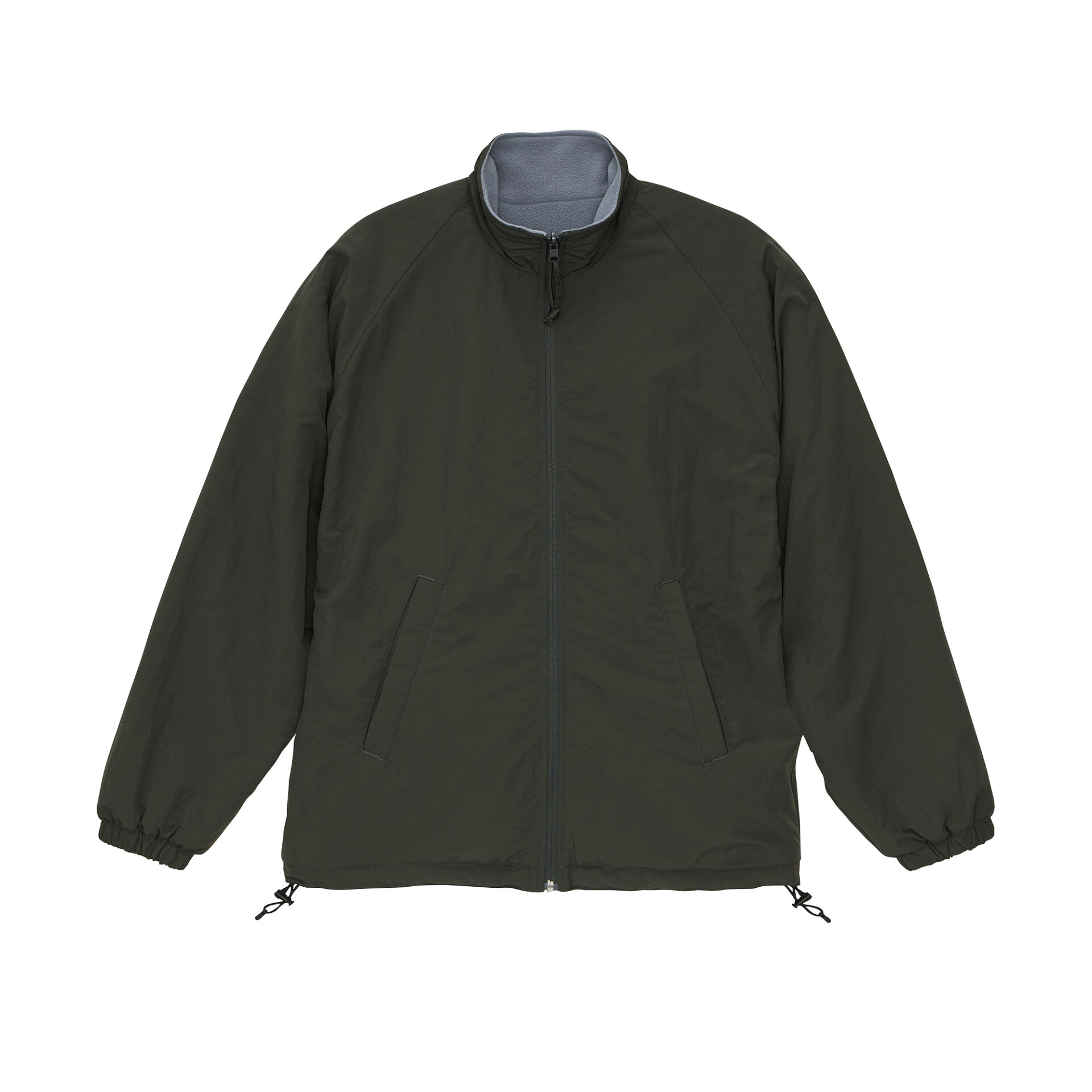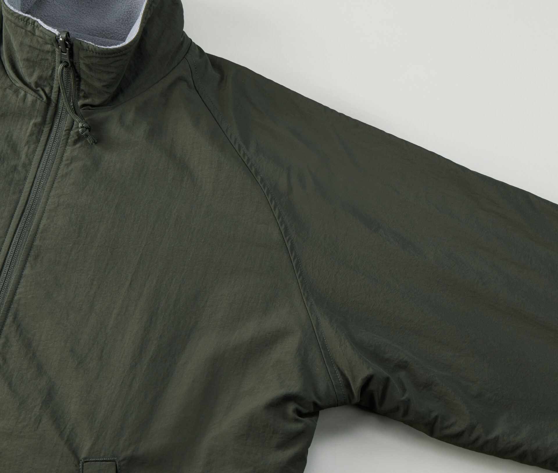 リバーシブル仕様で汎用性抜群のスタンドジャケット。ナイロン側を表にすればシンプルでスポーティーな雰囲気、フリース側を表にすれば、ゴープコアな雰囲気が楽しめる優れもの。どちらの面もゆったりとしたサイジングで着用できるラグラン仕様。フロントのジッパー部分は両面使えるYKK社製の回転オートマチックスライダーを採用し、目を引くパラコードの引き手がポイント。シャーリングの袖口は、フリースサイドで着たときに袖口からナイロン部分が覗いてアクセントになるように設計しています。また裾口にはドローコードを配し、お好みのシルエットに変えることも可能。気分に合わせて楽しめる、変幻自在のアウターです。