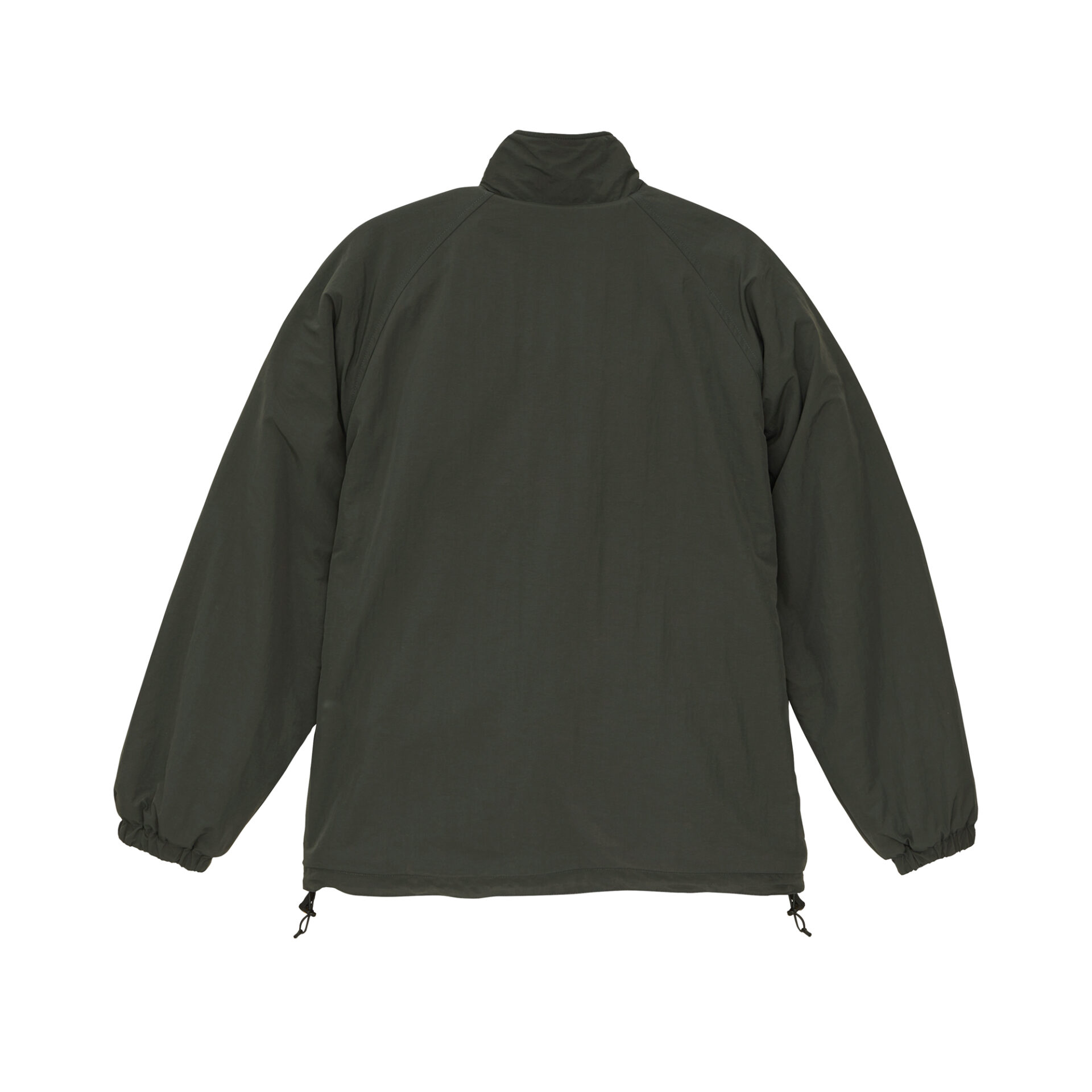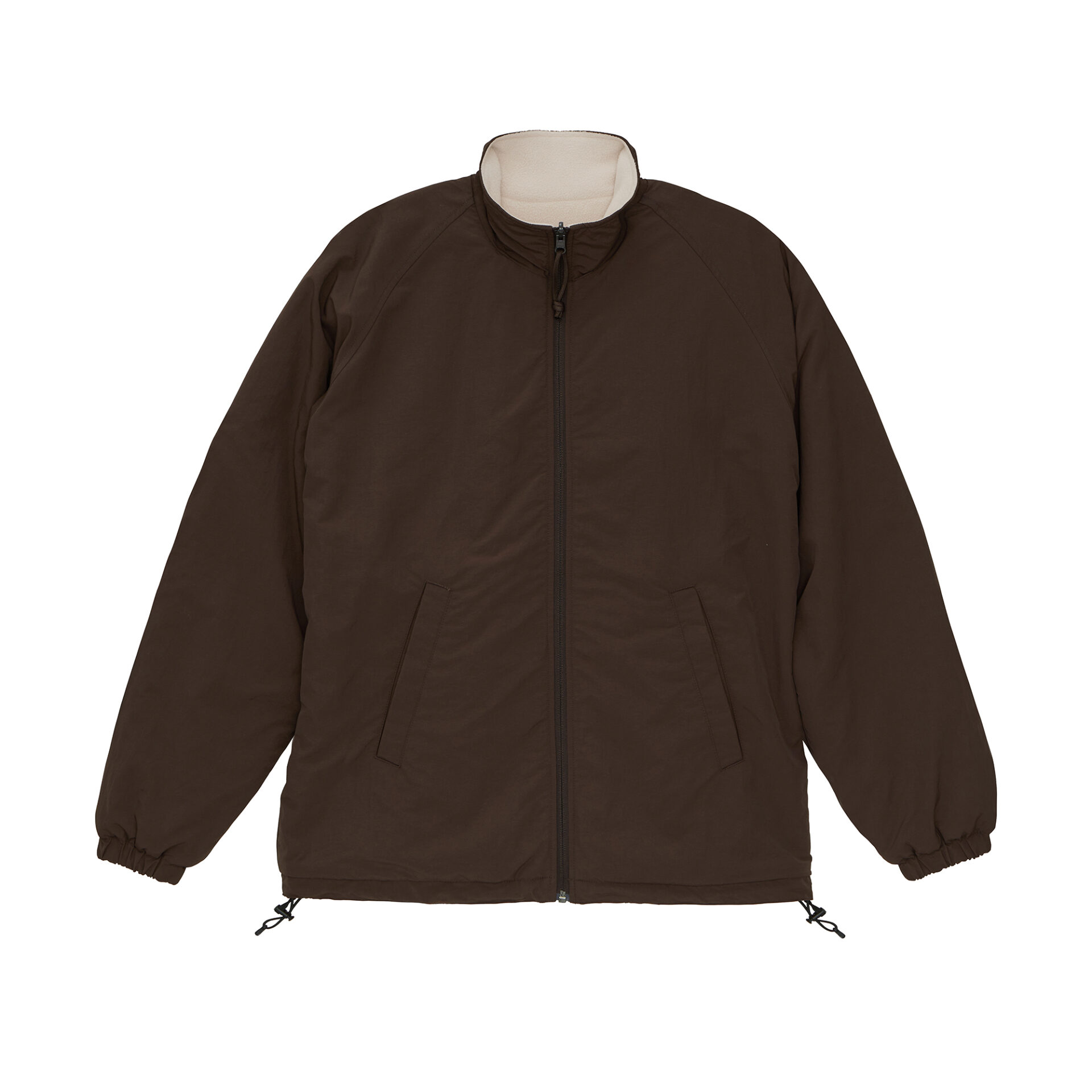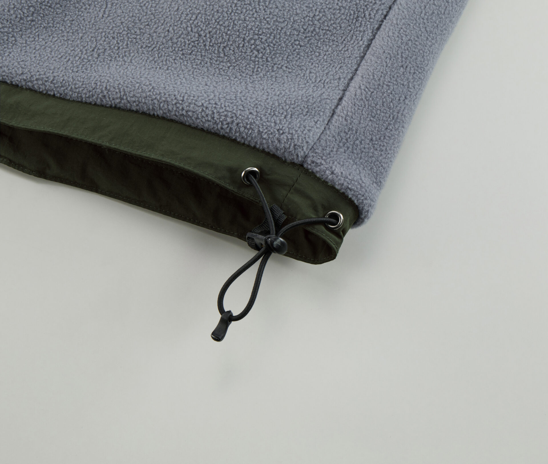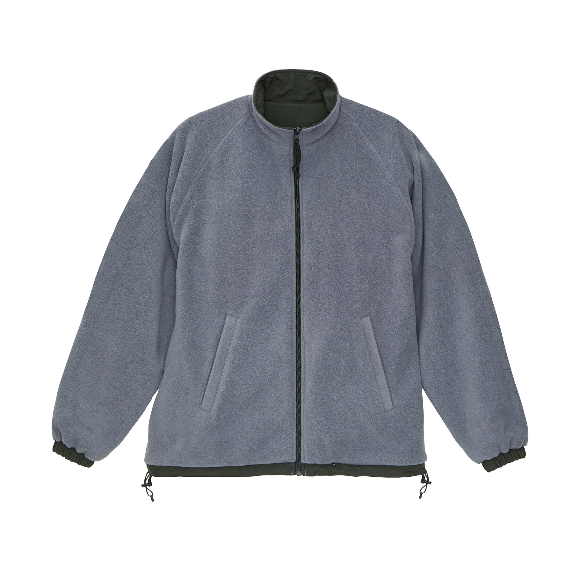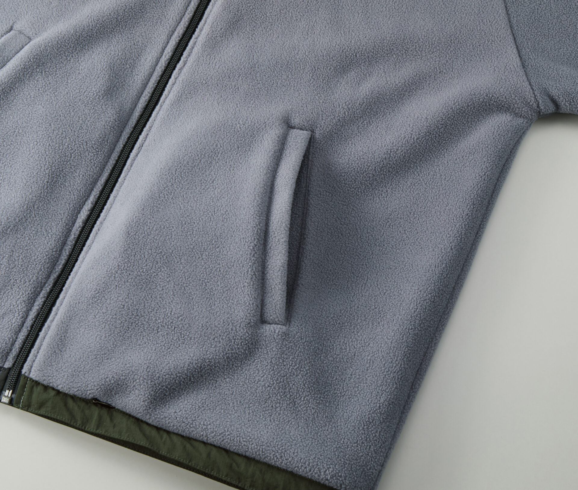 リバーシブル仕様で汎用性抜群のスタンドジャケット。ナイロン側を表にすればシンプルでスポーティーな雰囲気、フリース側を表にすれば、ゴープコアな雰囲気が楽しめる優れもの。どちらの面もゆったりとしたサイジングで着用できるラグラン仕様。フロントのジッパー部分は両面使えるYKK社製の回転オートマチックスライダーを採用し、目を引くパラコードの引き手がポイント。シャーリングの袖口は、フリースサイドで着たときに袖口からナイロン部分が覗いてアクセントになるように設計しています。また裾口にはドローコードを配し、お好みのシルエットに変えることも可能。気分に合わせて楽しめる、変幻自在のアウターです。