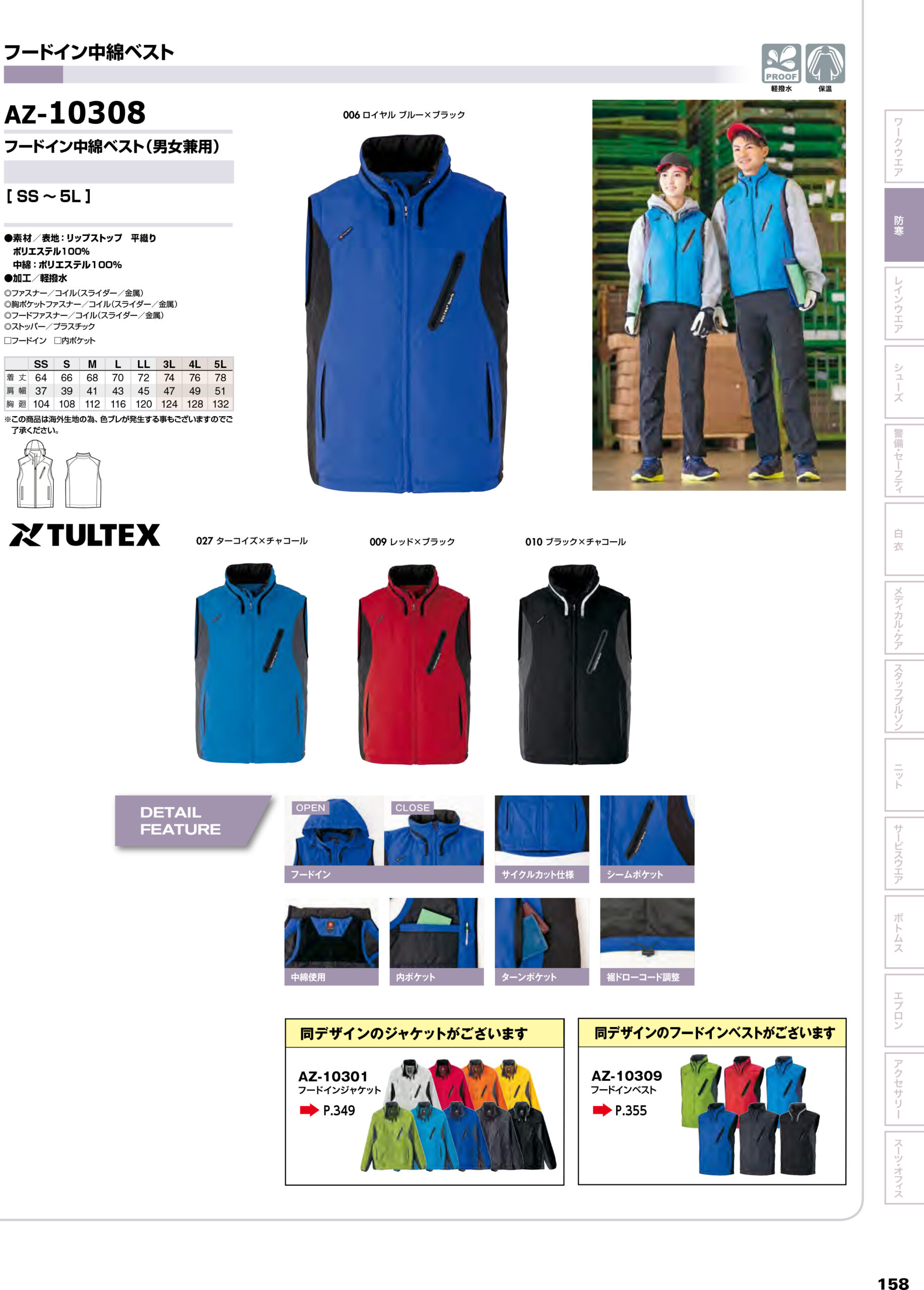 | 【AZ-10308フードイン中綿ベスト(男女兼用)】 ●素材/表地:リップストップ 平織り ポリエステル100% 中綿:ポリエステル100% ●加工/軽撥水 ◎ファスナー/コイル(スライダー/金属) ◎胸ポケットファスナー/コイル(スライダー/金属) ◎フードファスナー/コイル(スライダー/金属) ◎ストッパー/プラスチック □フードイン □内ポケット ※3L以上は、価格が変わります。 |