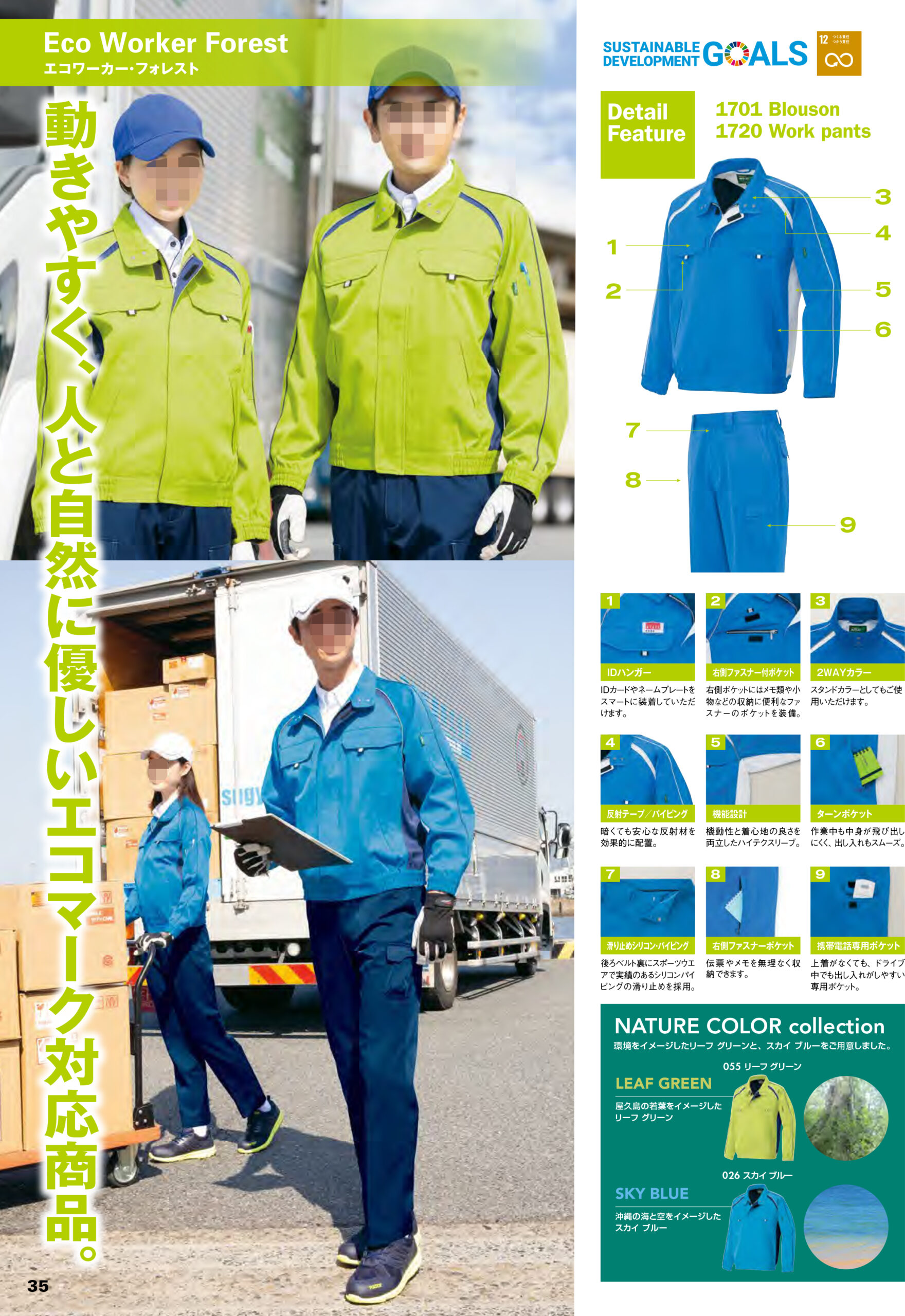 | 動きやすく、人と自然に優しいエコマーク対応商品。 環境をイメージしたリーフ グリーンと、スカイ ブルーをご用意しました。 【AZ-1701長袖ブルゾン(男女兼用)】