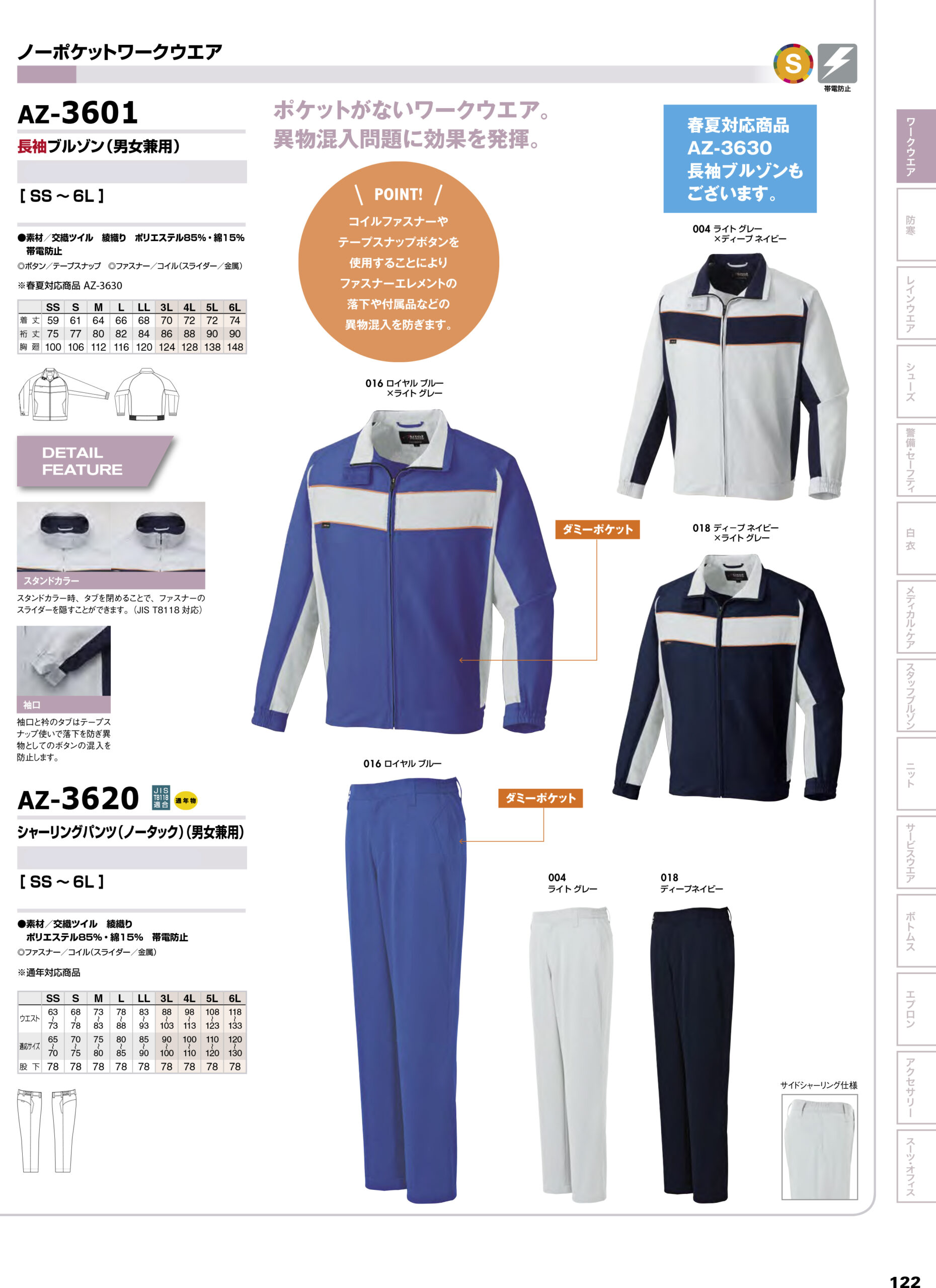 | ポケットがないワークウエア。 異物混入問題に効果を発揮。 【AZ-3601長袖ブルゾン(男女兼用)】