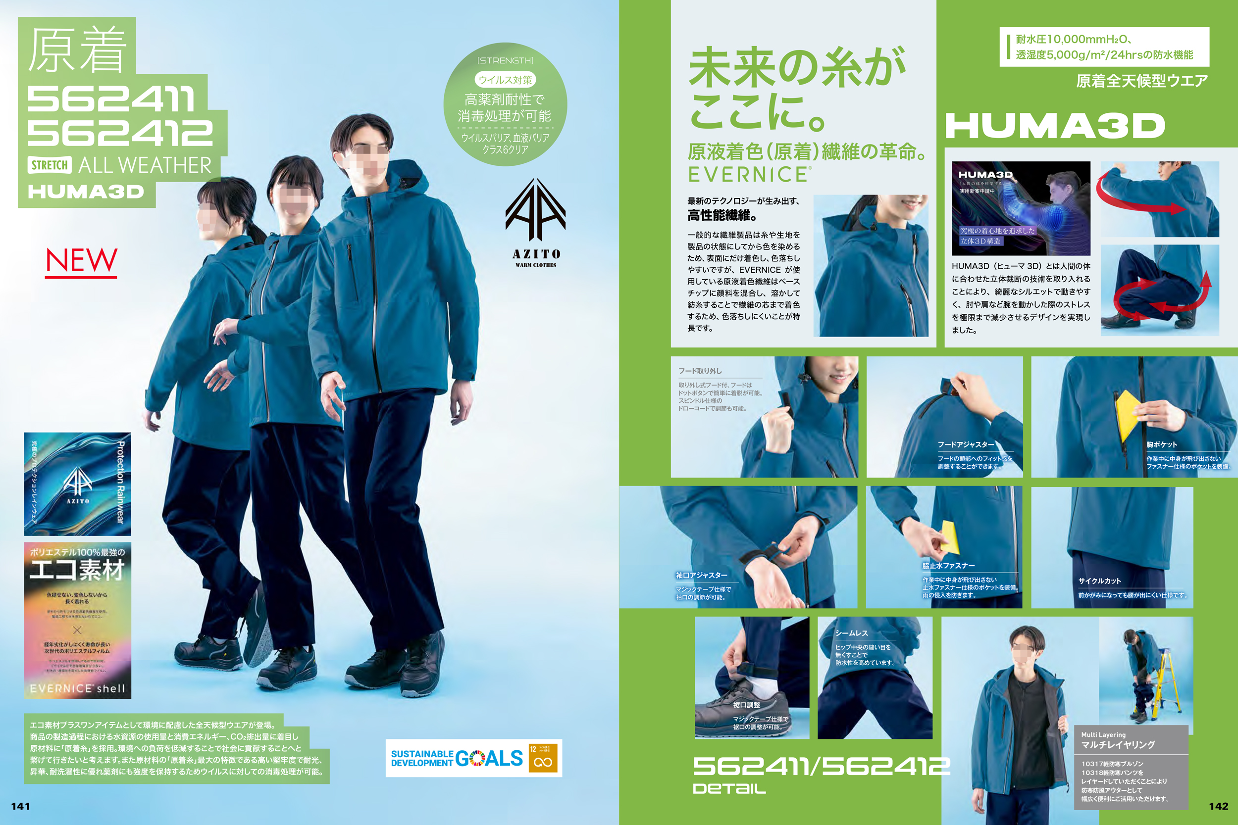 | 原着 一般的な繊維製品は糸や生地を製品の状態にしてから色を染めるため、表面にだけ着色し色落ちしやすいですが EVERNICEが使用している原液着色繊維は原料から色をつけるので繊維の芯まで着色するため、色落ちしにくいことが特長です。【AZ-562411原着全天候型ストレッチジャケット(男女兼用)】 ●素材/原着ストレッチ3層 平織り ポリエステル100% 透湿防水・ストレッチ・ECO素材 ●加工/耐水圧10,000mmH2O・ 透湿度5,000g/㎡ /24hrs・シームテープ ◎ファスナー/止水ファスナー ◎ポケットファスナー/止水ファスナー □裏前立て仕様 □HUMA3D立体裁断 □フード取り外し可能 □マジックテープ/(袖・フード止め)