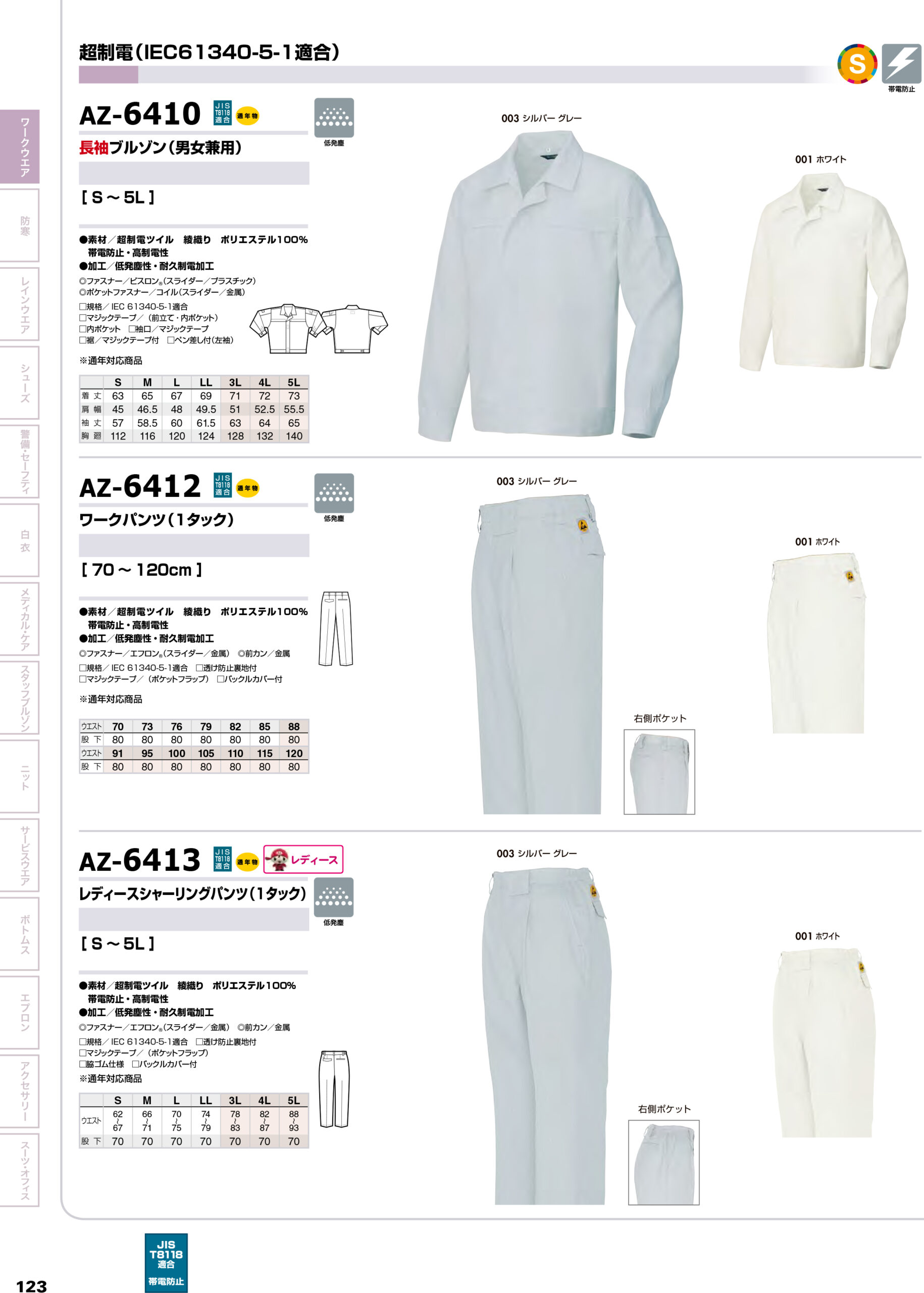 | 【AZ-6410長袖ブルゾン(男女兼用)】 ●素材/超制電ツイル 綾織り ポリエステル100% 帯電防止・高制電性 ●加工/低発塵性・耐久制電加工 ◎ファスナー/ビスロン® (スライダー/プラスチック) ◎ポケットファスナー/コイル(スライダー/金属) □規格/ IEC 61340-5-1適合 □マジックテープ/(前立て・内ポケット) □内ポケット □袖口/マジックテープ □裾/マジックテープ付 □ペン差し付(左袖) ※通年対応商品 【AZ-6412ワークパンツ(1タック)】