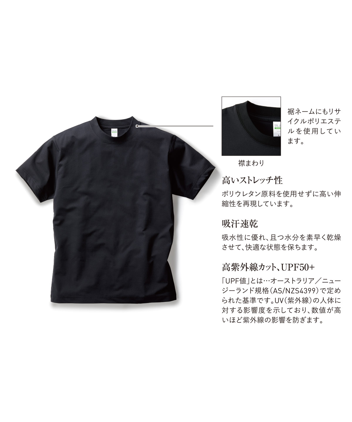 リサイクルポリエステル50% バージンのポリエステル50%の含有率(ポリエステル100%) でありながら,生地の光沢感を抑えることで、 一見コットンTに見えるような具合で仕上げてあるアウターTシャツとしても活躍できるドライTシャツです。