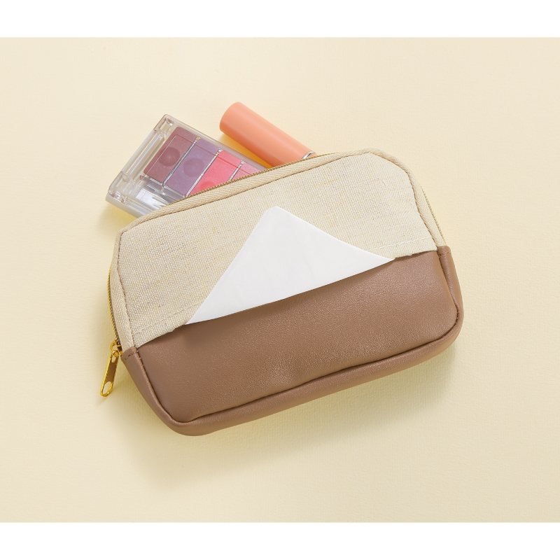 持ち歩きやすいスリムなポーチ。ティッシュポケットを備えてさらに使いやすく。