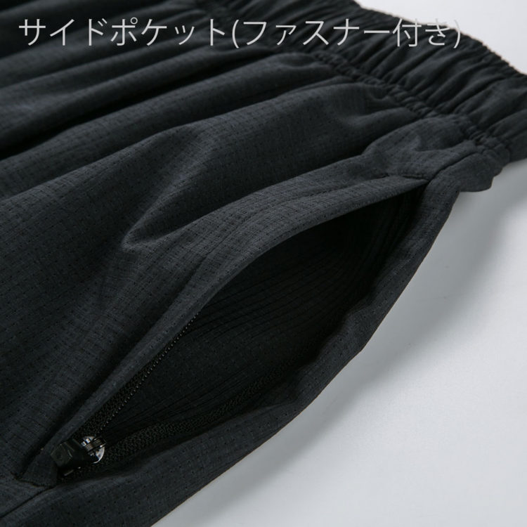 ポリエステル100%の吸汗速乾素材を使用した、通気性の良い布帛生地のハーフパンツです。両サイドポケットにはファスナーがついており、小物を入れたままでのランニングも安心。