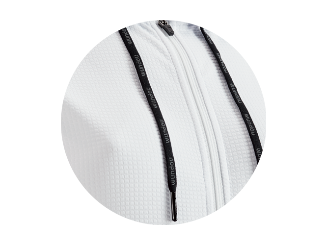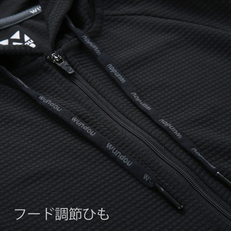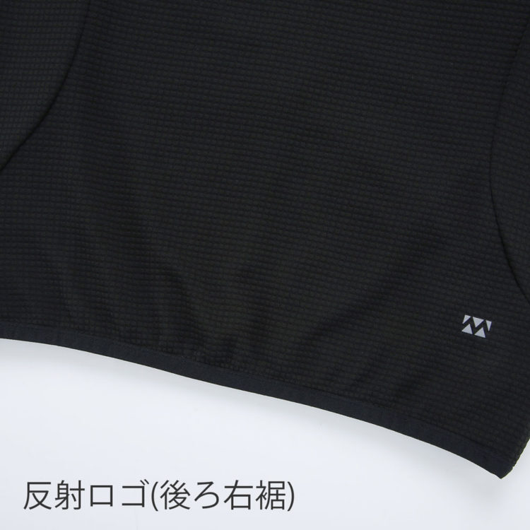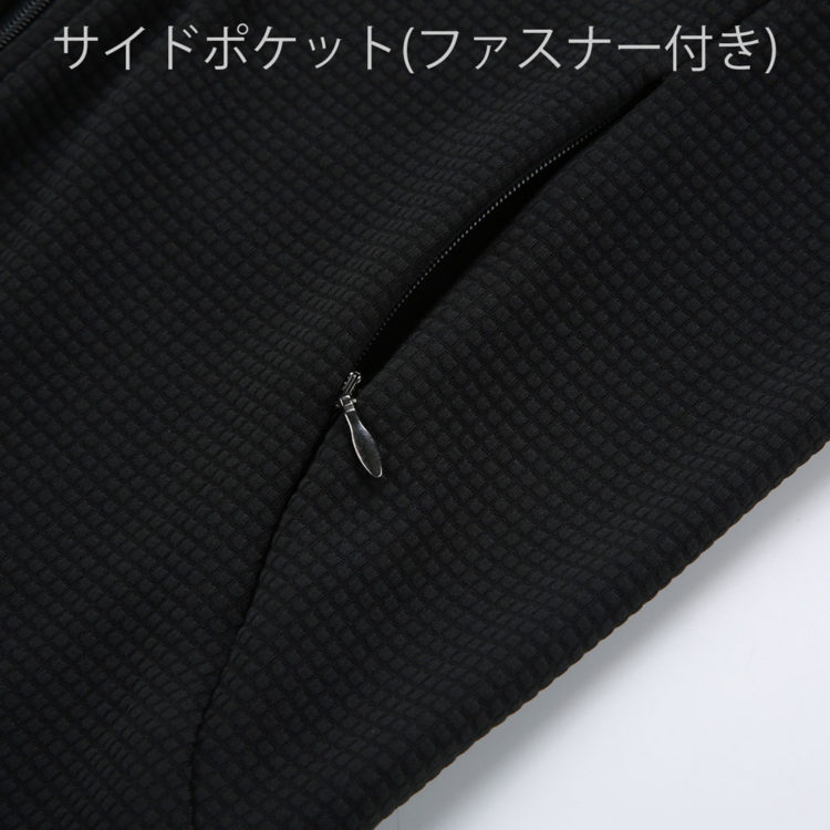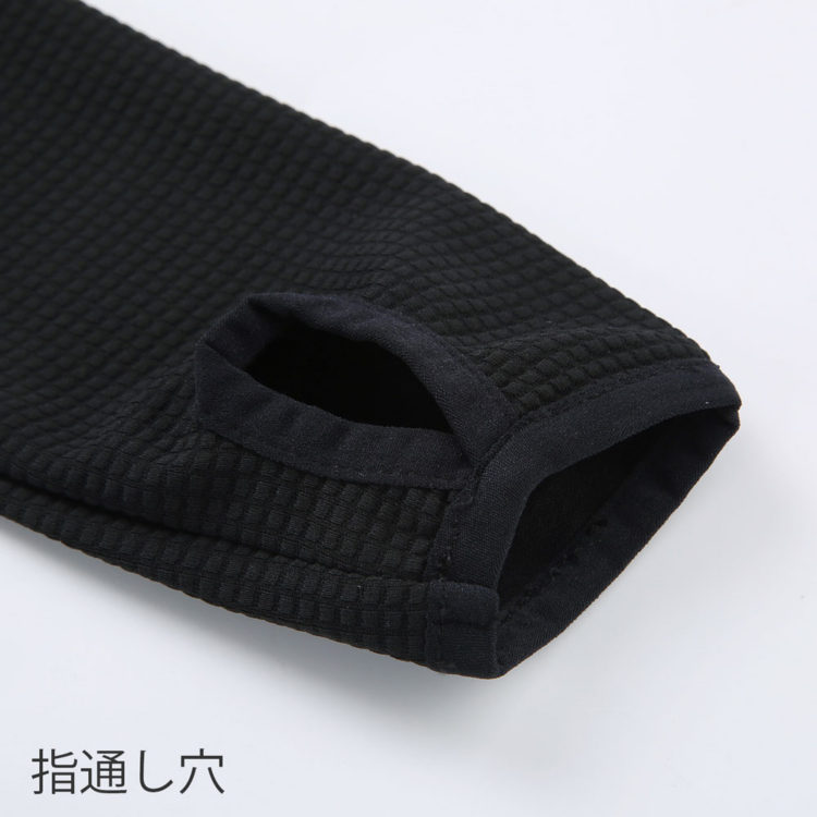 表面がワッフル状になった吸汗速乾ニット素材を使用しています。袖口、裾口には伸びるテープを使いフィット性と着心地をアップ。袖口には指通し穴も付いています。左右ポケットはファスナー付きで小物を入れても安心です。