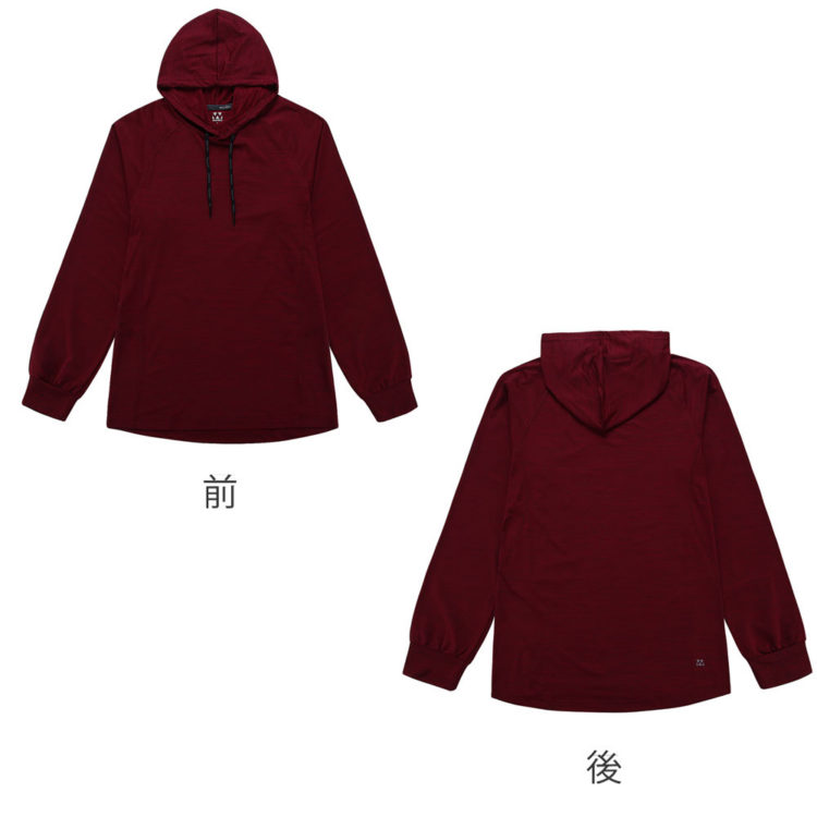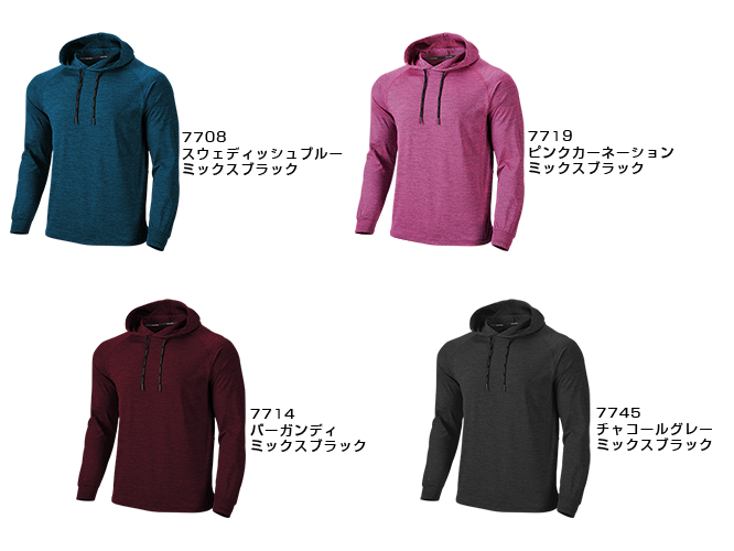 ラグラン袖で動きやすい、パーカー付きのユニセックス対応の長袖Tシャツ。ポリエステル94%、ポリウレタン6%の吸汗速乾+裏側メッシュでいつもサラッとした着心地です。ダークなミックスカラーは年齢を選ばず幅広いニーズに対応します。
