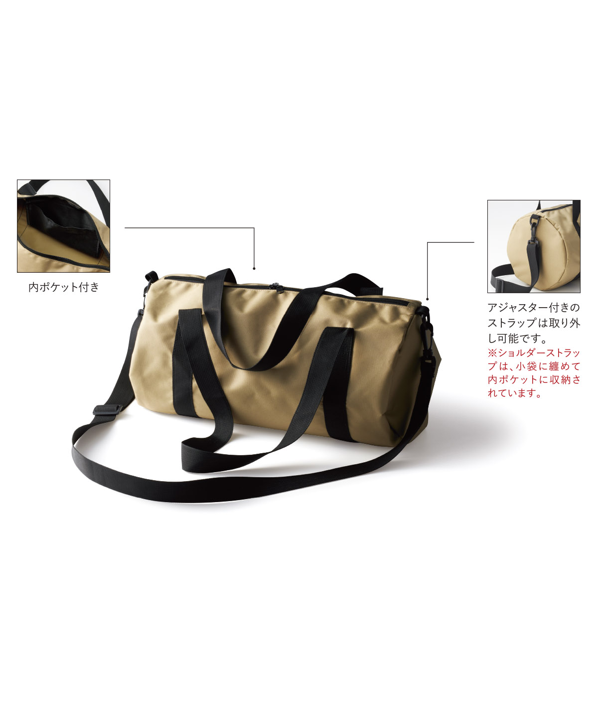 ◎アジャスター付きのストラップは取り外し可能です。※ショルダーストラップは、小袋に纏めて内ポケットに収納されています。