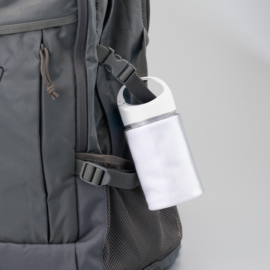 カラビナ付きなのでリュックなどお好きな場所に引っ掛けて持ち運べます。
