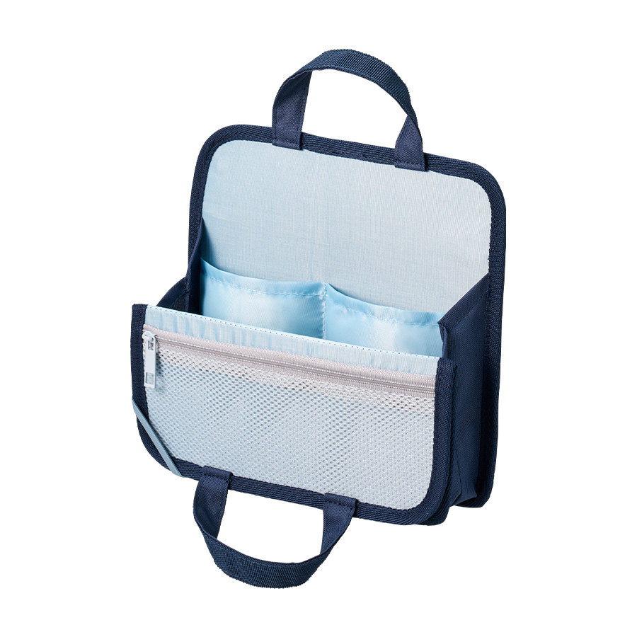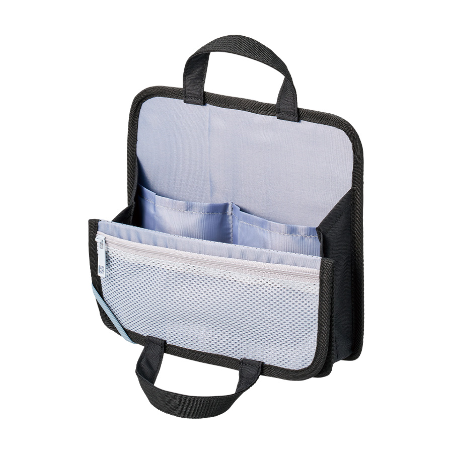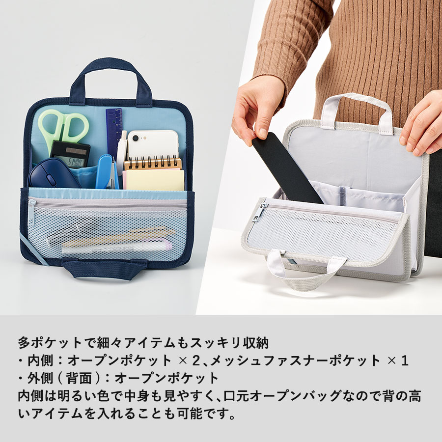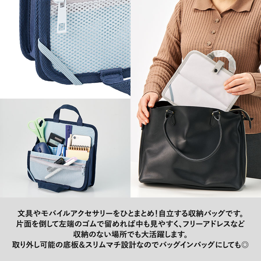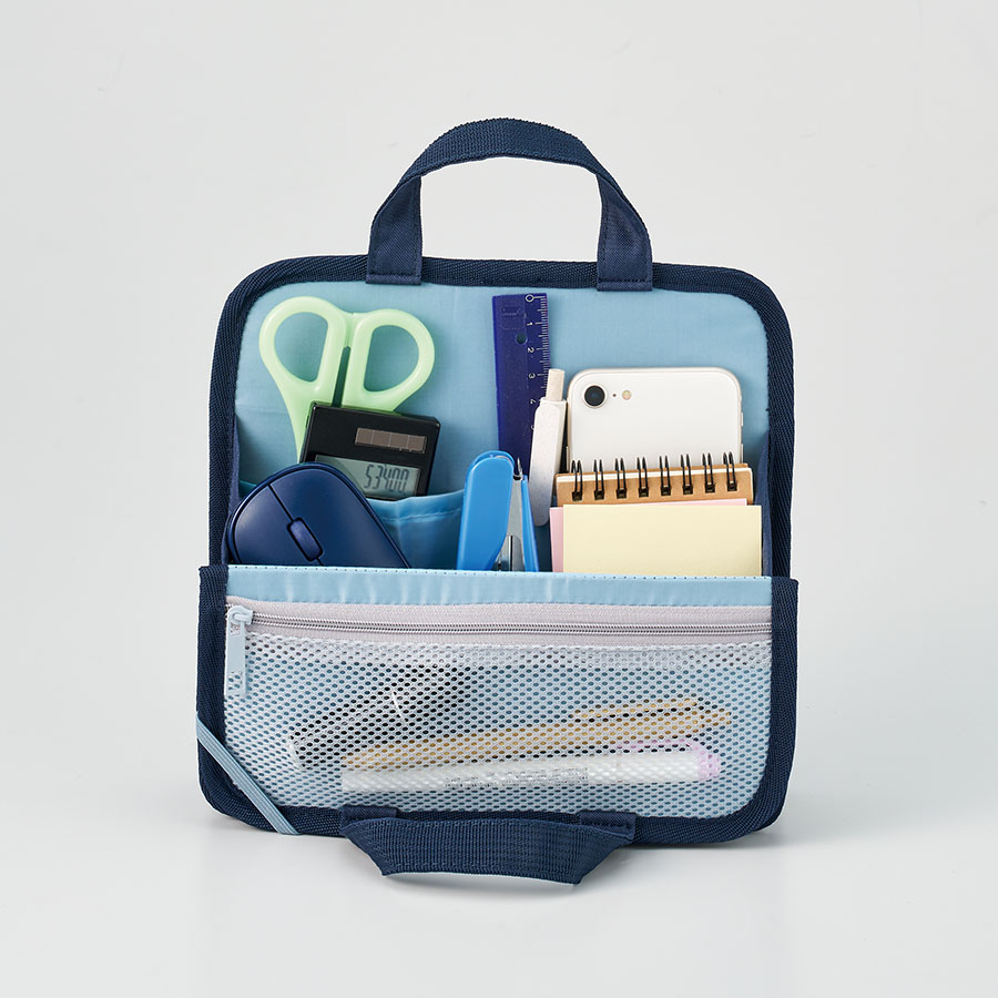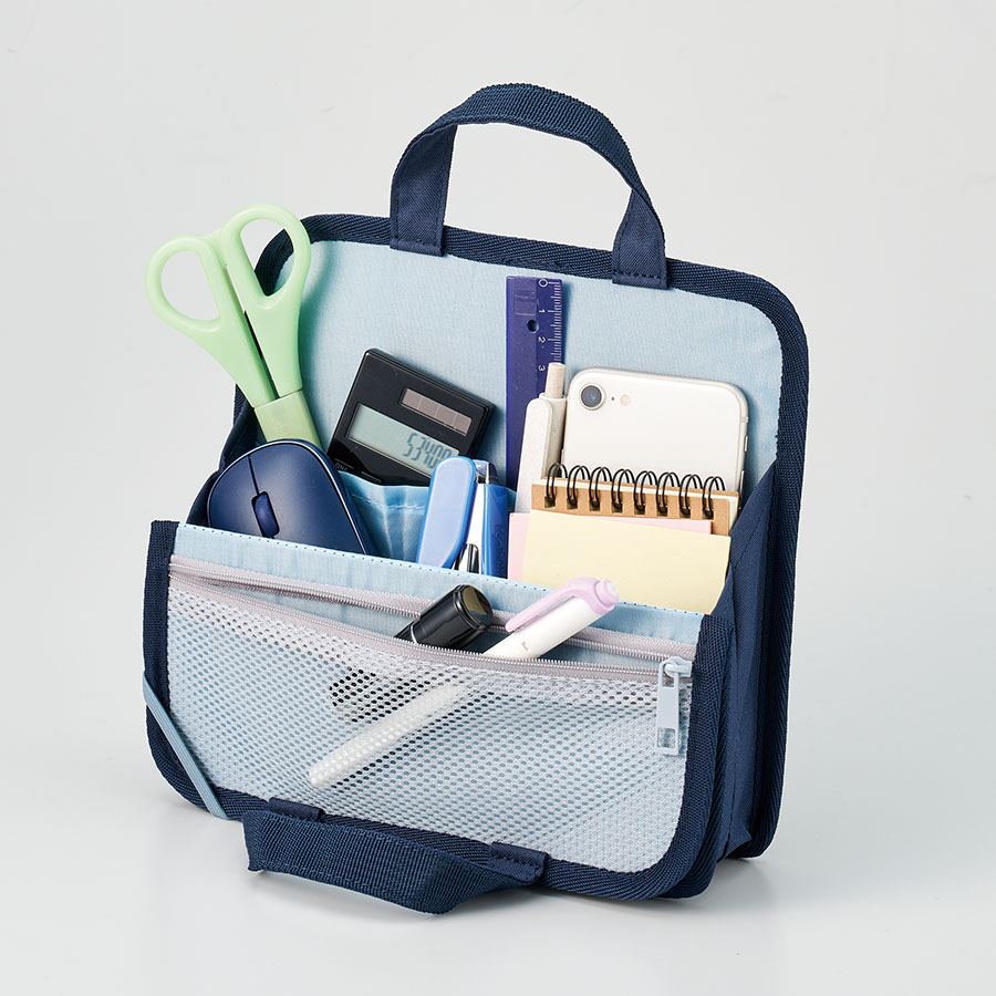 文具やモバイルアクセサリーをひとまとめにできる持ち運びに便利な収納バッグです。