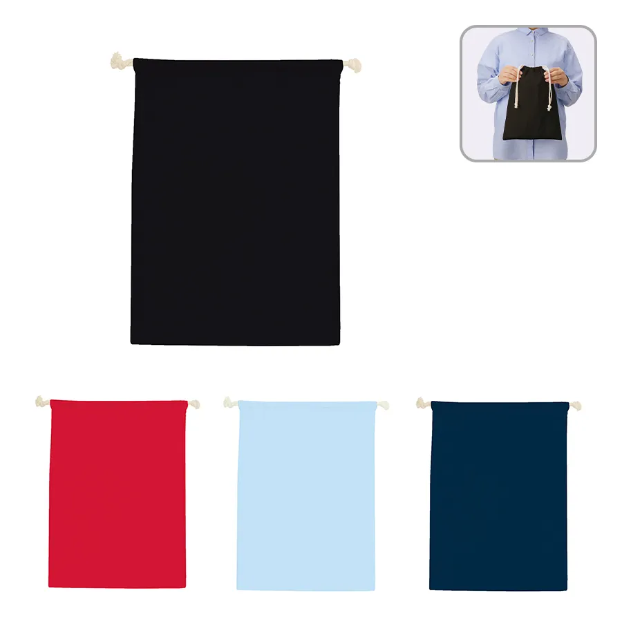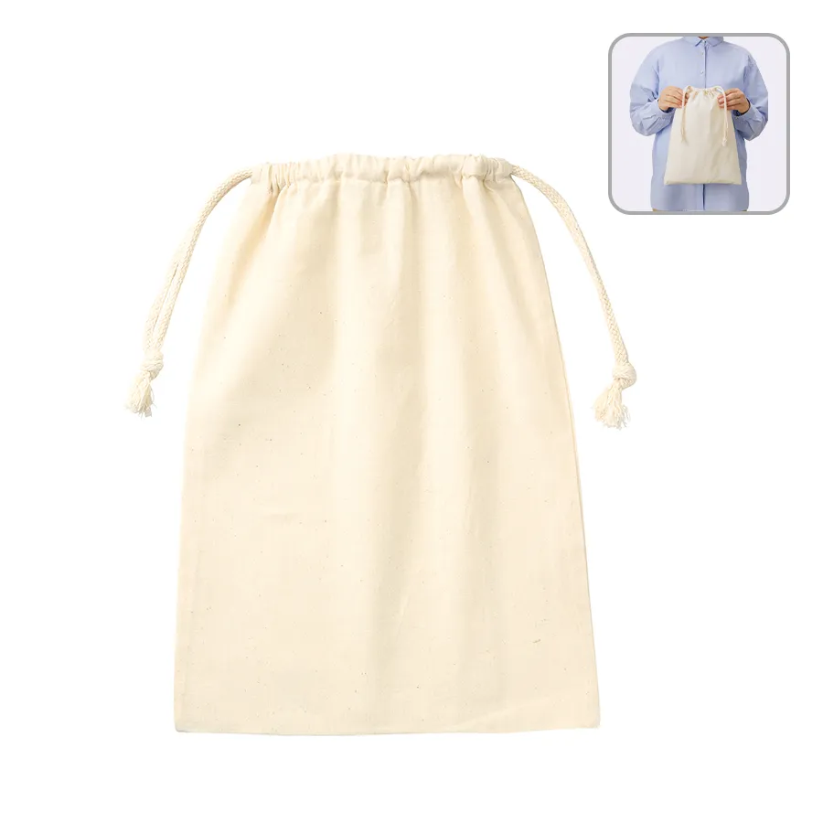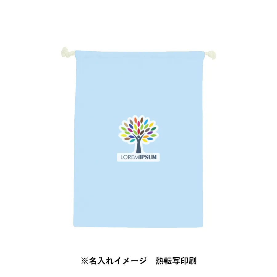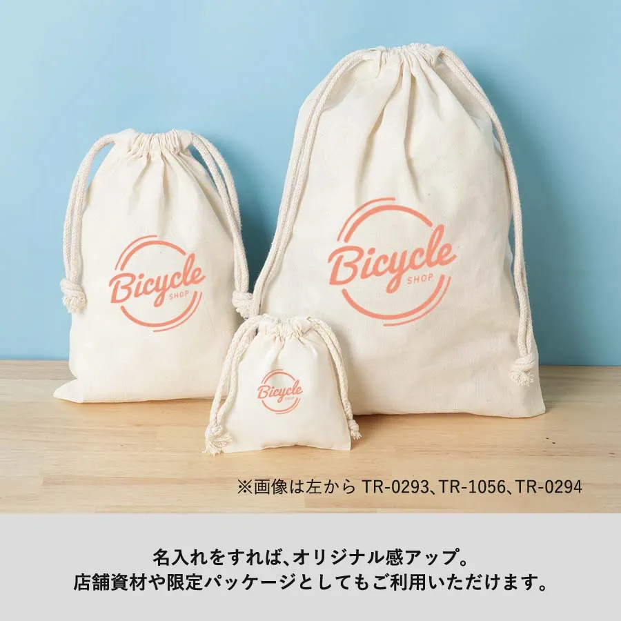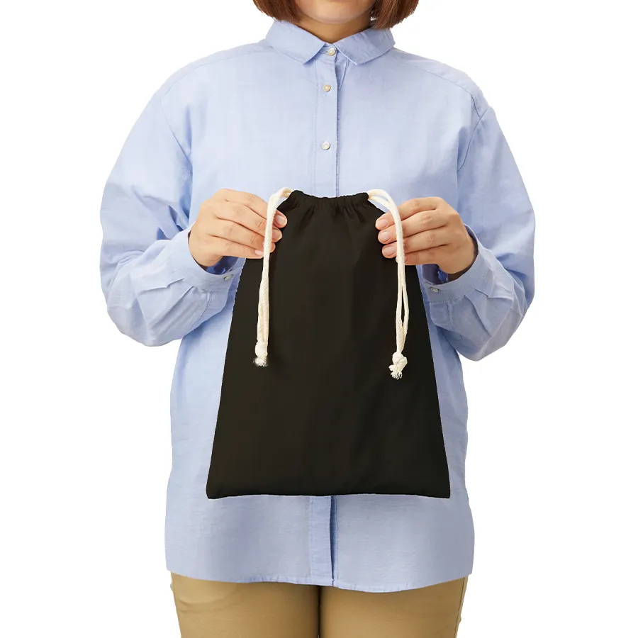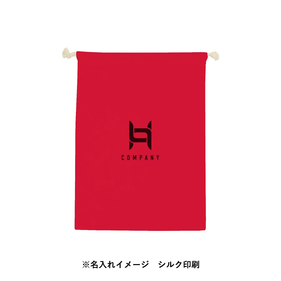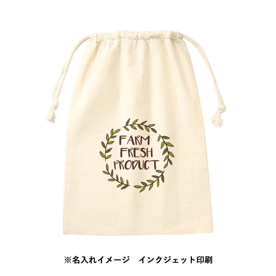 商品パッケージやギフト包装としてもご好評をいただいている使い勝手の良いコットン巾着です。A4サイズも余裕を持って収容でき、やわらかい生地感が中に入れる商品をやさしく包み込みます。名入れもシルク印刷での単色からフルカラーの熱転写加工まで対応しています。同じ仕様で【Mサイズ】もございます。