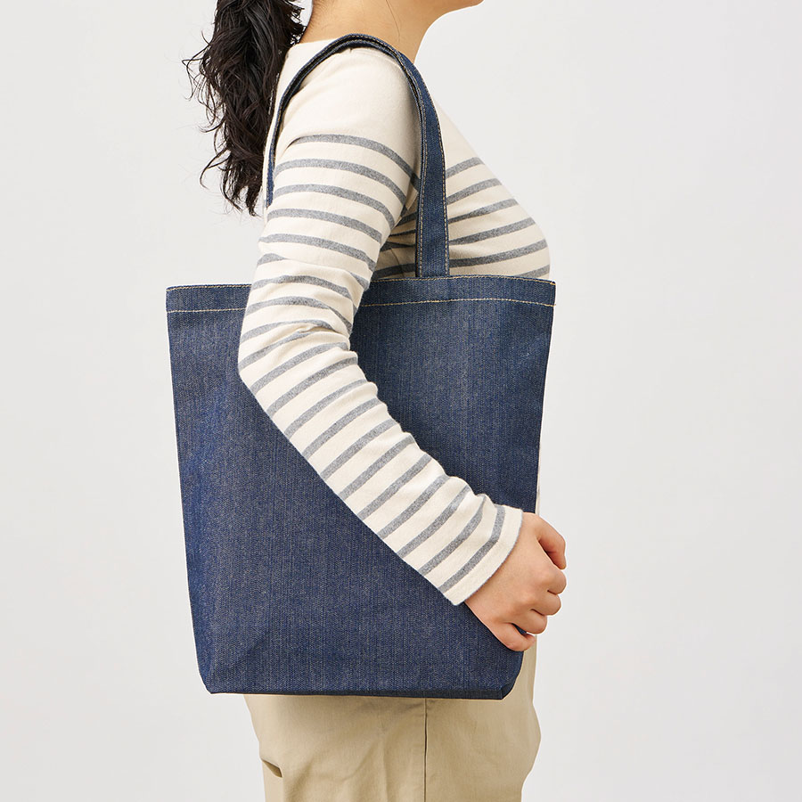 定番の舟形デザインで使いやすい人気のデニムトートバッグです。
