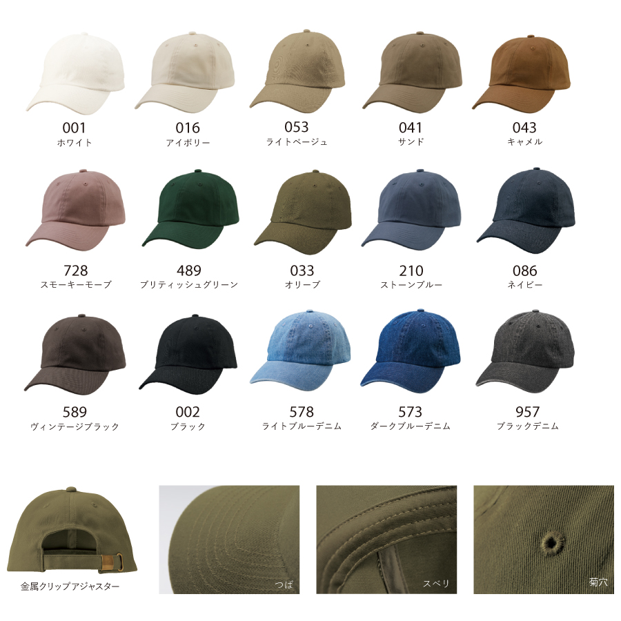 ツイル生地のほどよいハリ感が特徴の浅めキャップ。金属クリップアジャスターでサイズ調整が可能なうえ、ベーシックカラー展開でコーディネートしやすいため、男女問わず人気です。シンプルなデザインながら高級感があり、普段づかいからユニフォーム用途まで、幅広いシーンに対応します。