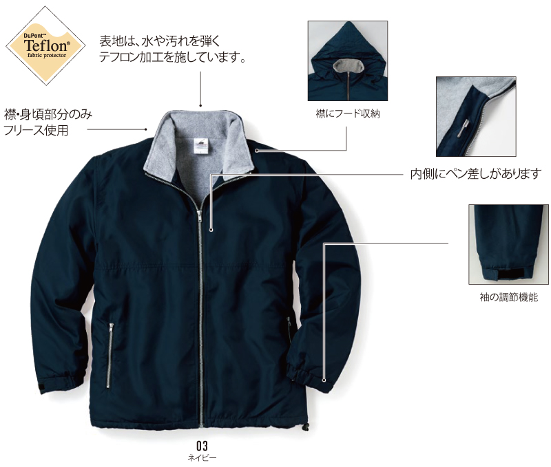 裏フリースで軽くてあったか。 (襟・身頃部分フリース使用) 表地は、水や汚れを弾くテフロン加工を施しています。