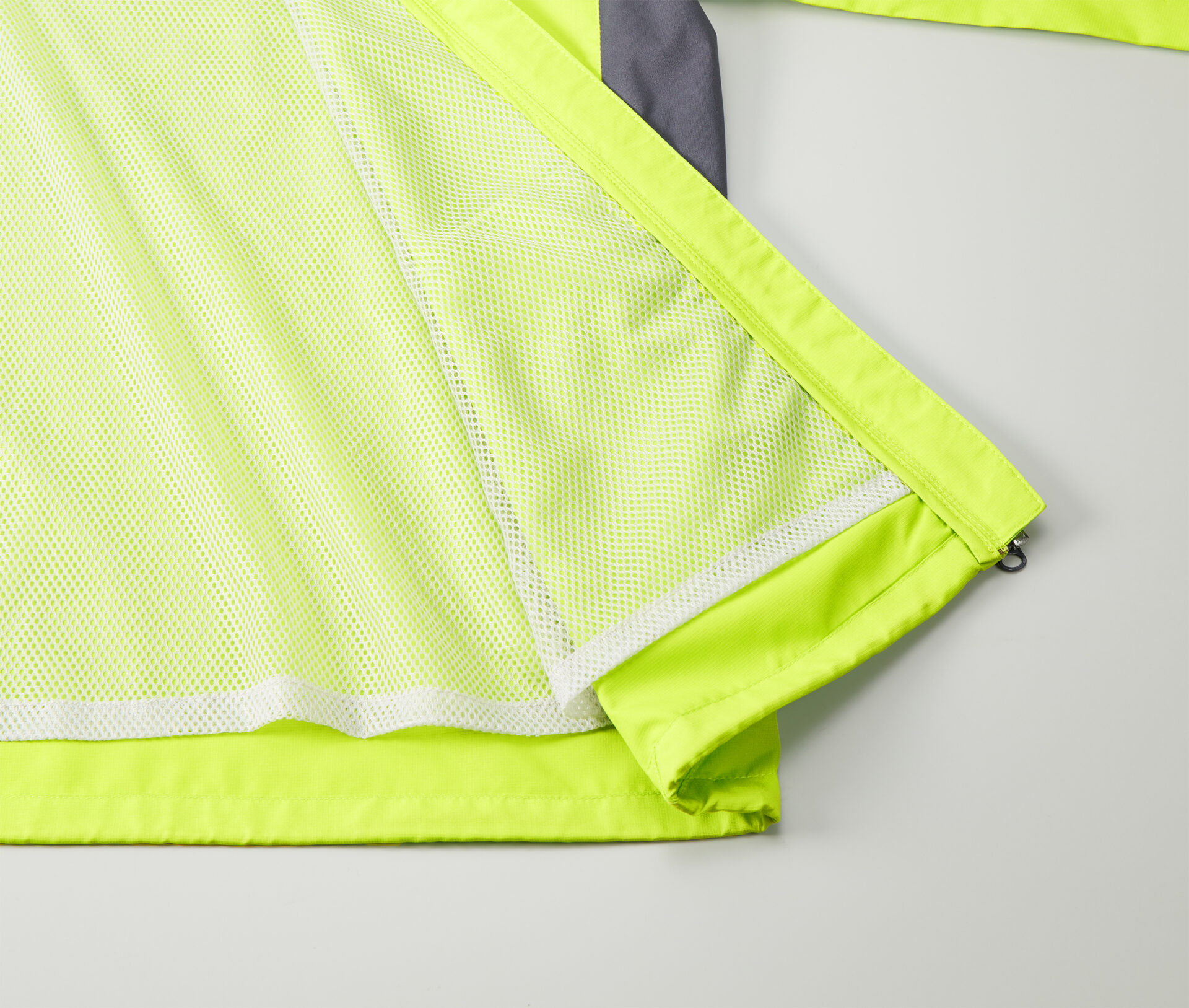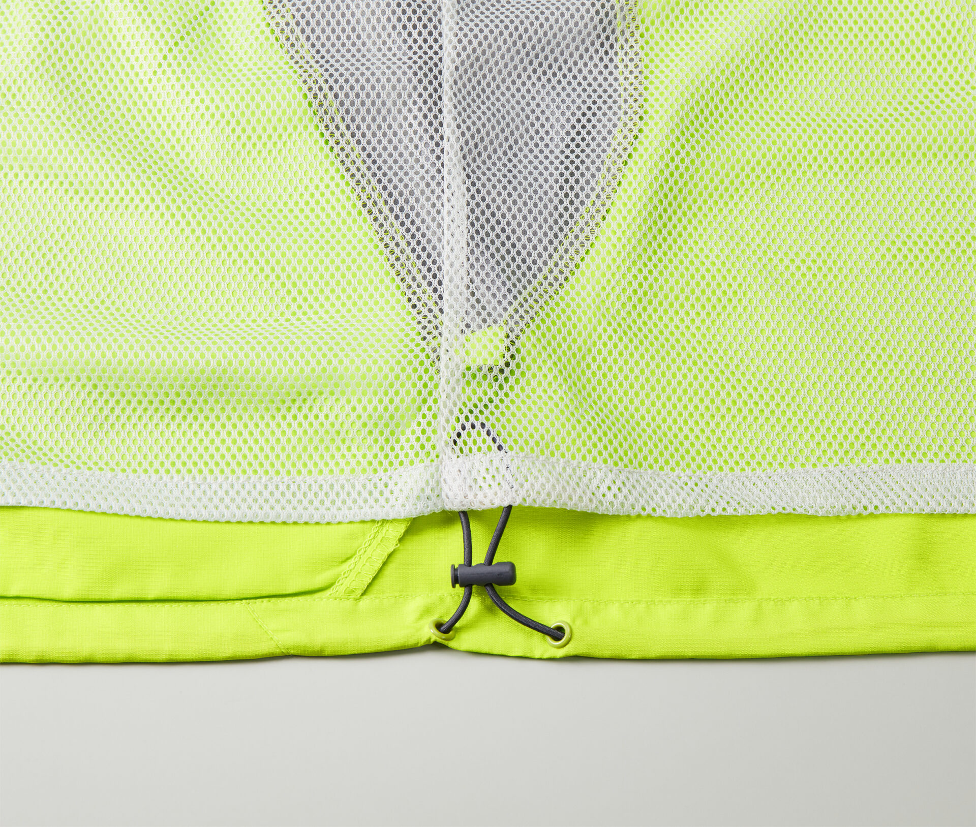 - 裾には、風の侵入やウェアのバタつきを調整できるストッパーとドローコード仕様