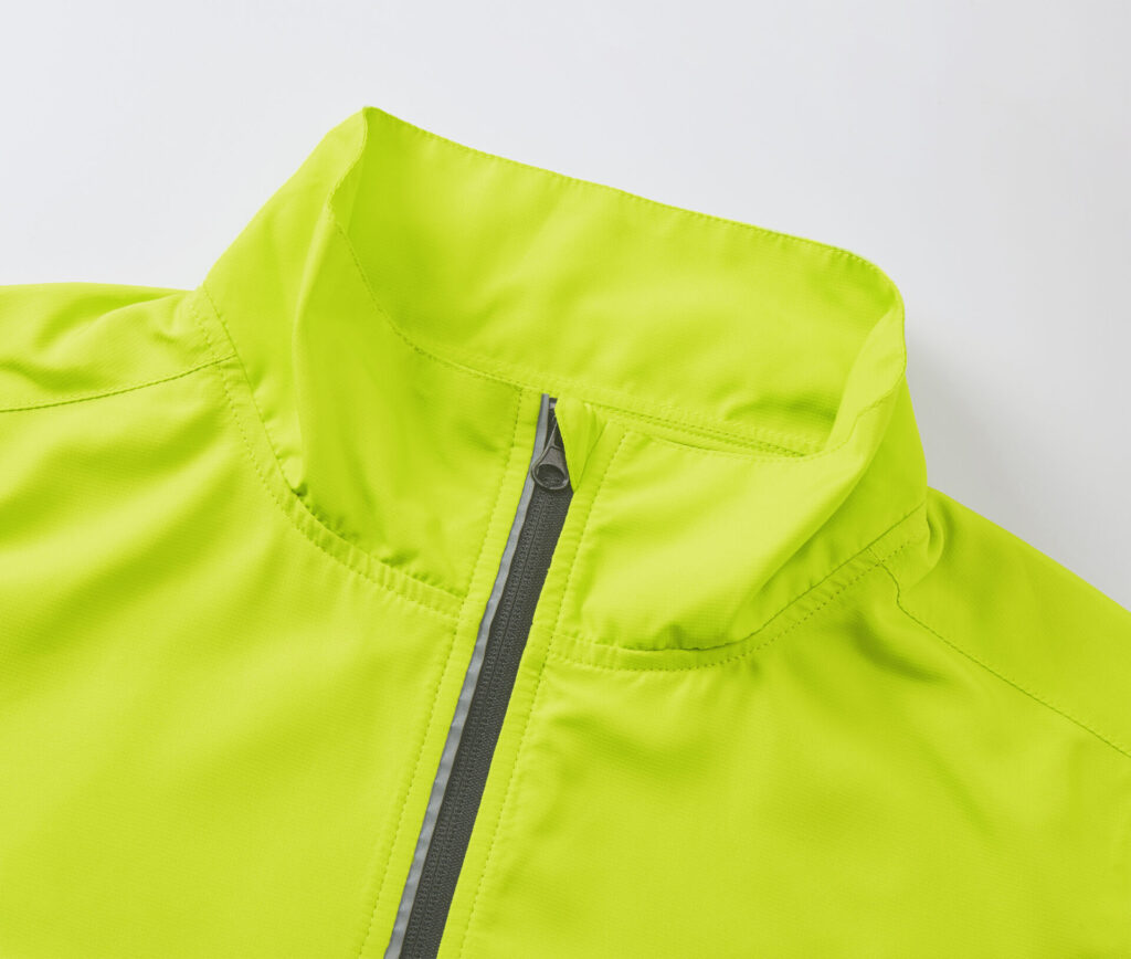 - 襟はスタンドカラー、顎を守るチンガード仕様、リフレクターテープ付き